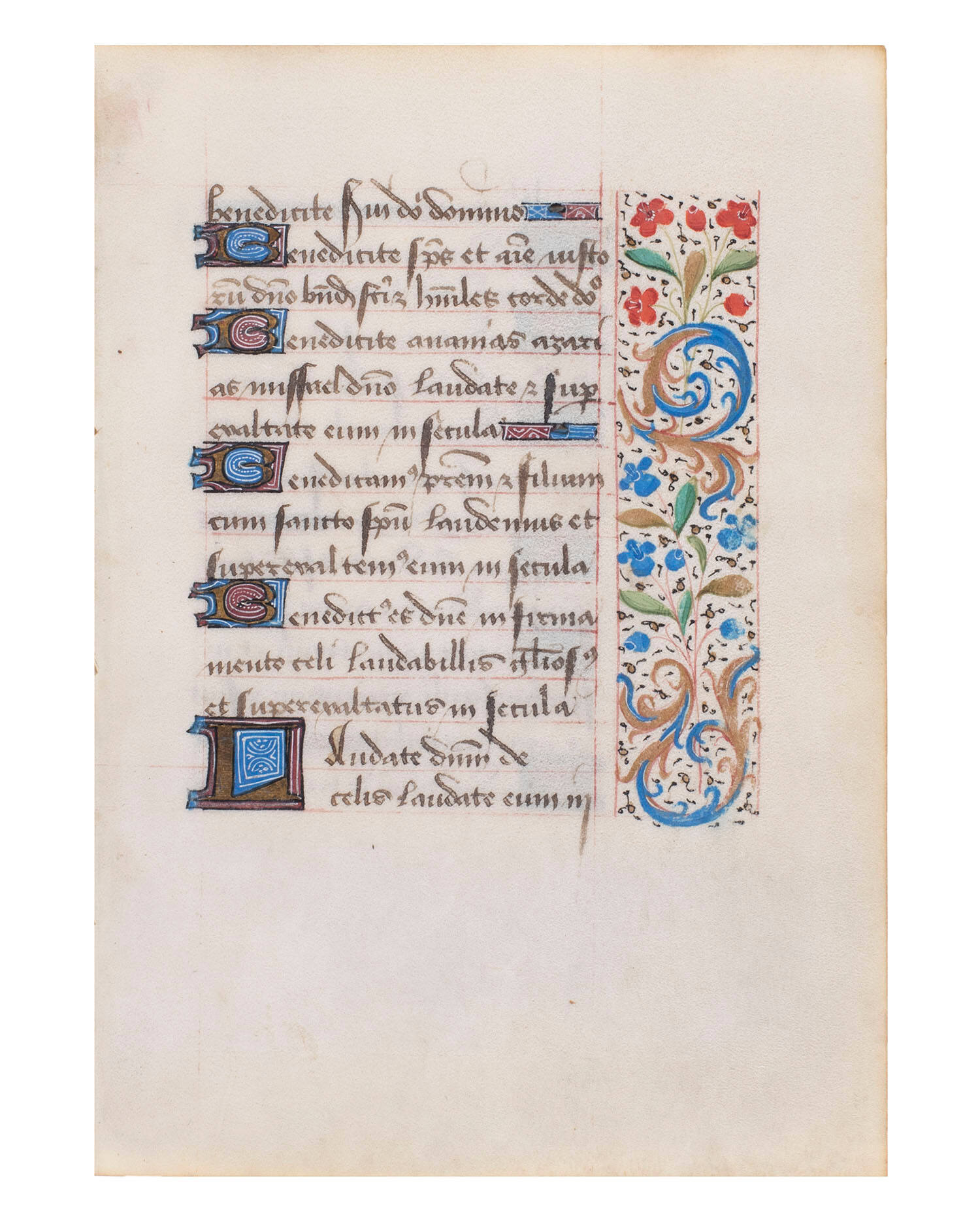 Label TextBy the early sixteenth century,Books of Hours were being printed, but there was still a demand for elaborate illuminated manuscripts. On this leaf, the page is accented by the bold flourished initials. The text has its own contained space besides the pretty floral border.mid 15th century