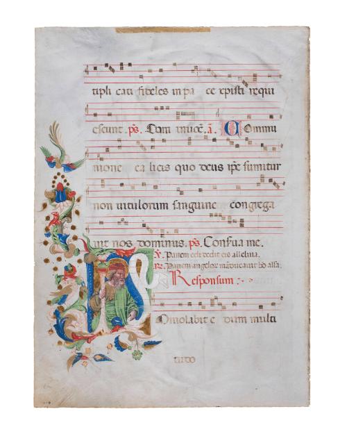 Label TextExotic birds, a fire breathing dragon, and ornate foliage frame the central haloed figure who gazes toward the music notation of these leaf from an as yet unidentified piece of antiphonal music (a type of music performed by two interacting choirs, usually singing alternate musical phrases). Cristoforo Cortese, a Venetian artist, created this unfinished miniature during the mid-15th century, when the invention of the printing press marked the twilight of manuscripts created by hand. The red four-line staff contains neumes, square notation, a forerunner of today’s five-line staff and notes, but differs because it represents flexible rhythm—more a suggestion than an exact value. The three gold diamond shapes on the far left of each staff represent an “F” clef, denoting the “F” line on the staff. The custos, a check mark at the end of each staff, prepared singers for the first note on the next line. Note the rubrics—letters in red—representing abbreviated instructions for the singers: p̃s (psalm) ã (amen) v (verse) r (responsories)Exhibition HistoryToledo Museum of Art, Looks Good on Paper: Masterworks and Favorites, Oct. 10, 2014-Jan. 11, 2015.