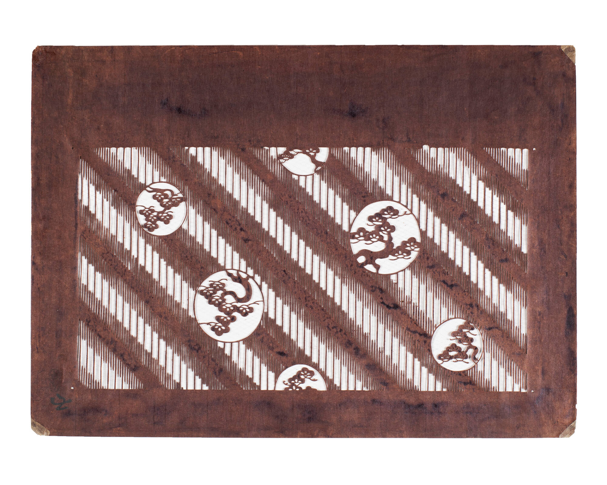 DescriptionPine trees in circle and pine needle motive. Paper stencil.