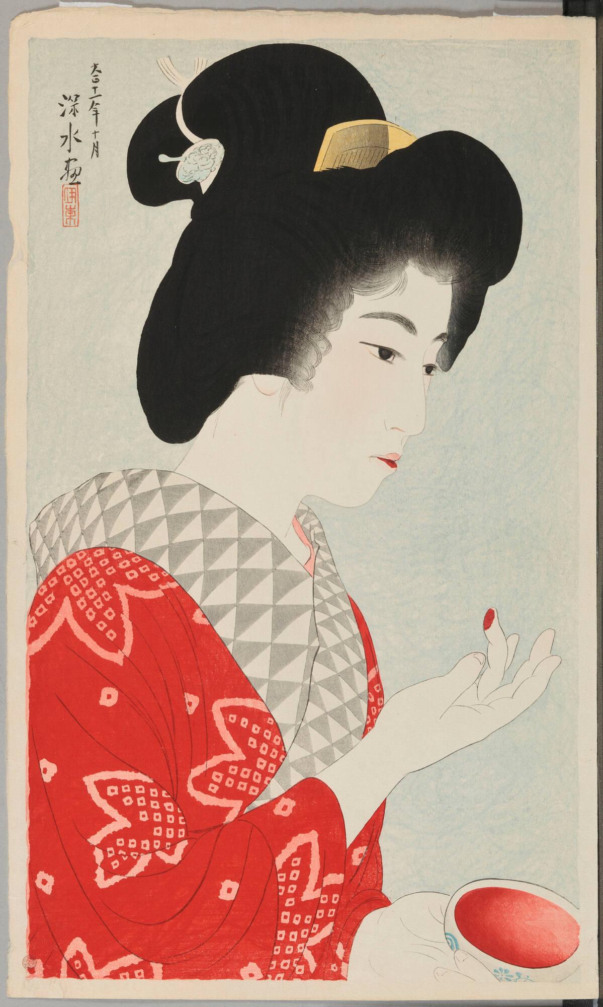 Exhibition HistoryToledo, Toledo Museum of Art, A Special Exhibition of Modern Japanese Prints, March 2-March 30, 1930, repr. pl. 12.Toledo, Toledo Museum of Art, Strong Women Beautiful Men: Japanese Portrait Prints from the Toledo Museum of Art, Toledo, Ohio, October 14, 2005-January 2, 2006.