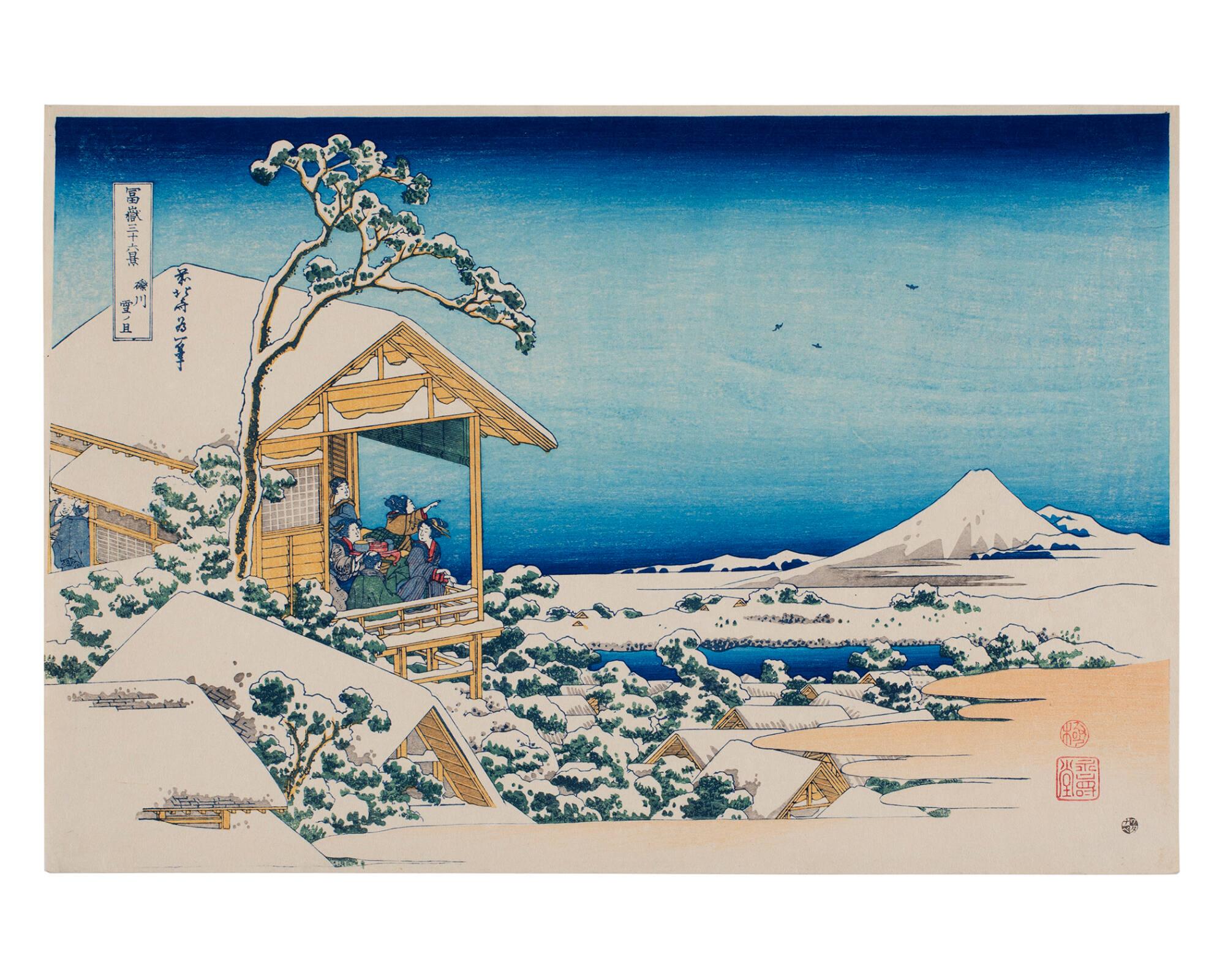 DescriptionTeahouse on the slope to the left, Fuji to the right; winter scene.