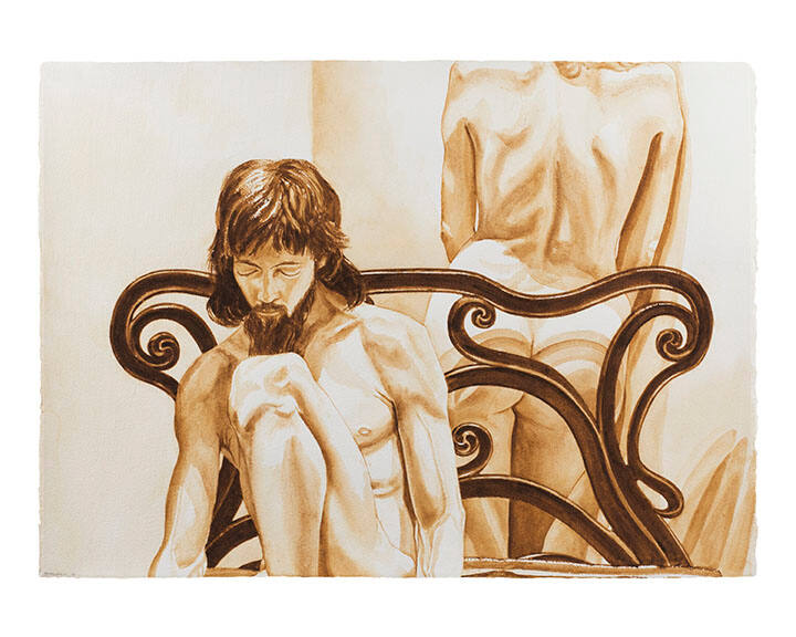 Male Model Seated On A Cast Iron Bed, Female Standing Nearby