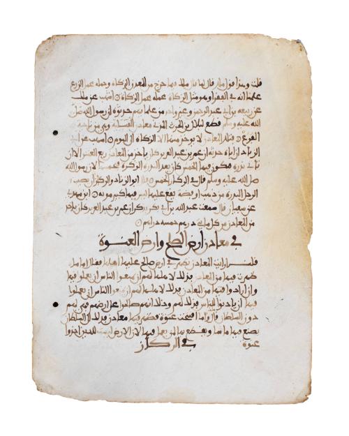 DescriptionA single manuscript leaf. It preserves a legal discussion on zakat—specifically the taxation of minerals (maʿādin) and buried treasure (rikāz)—from a medieval Islamic treatise on jurisprudence.