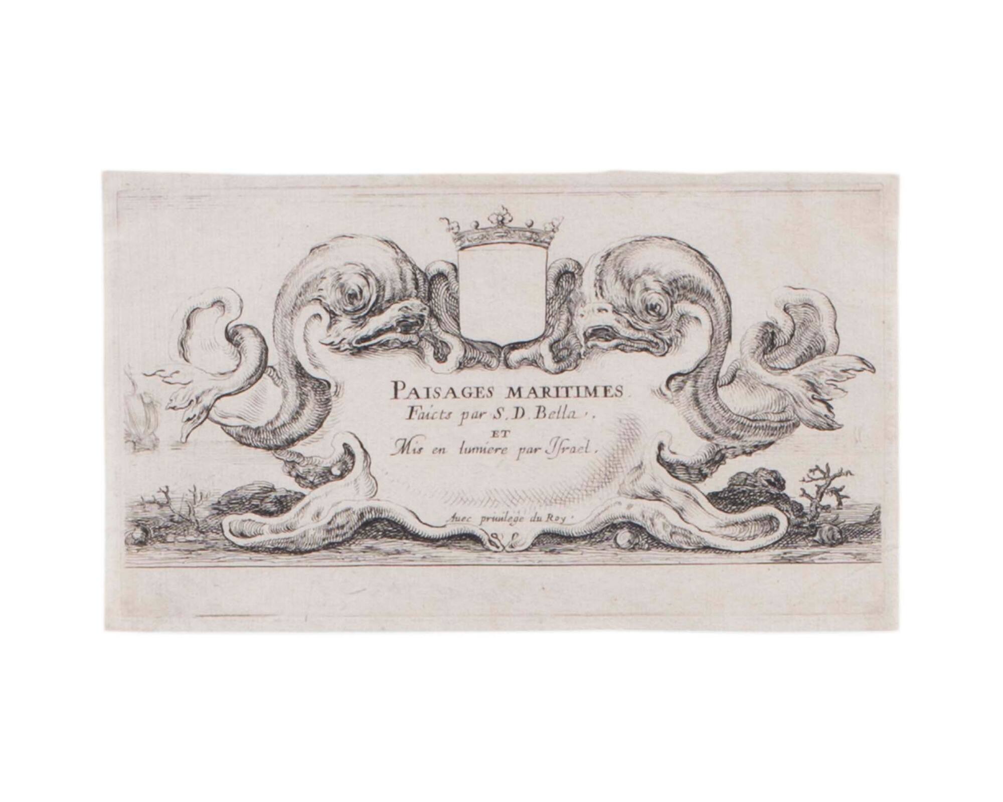 DescriptionTitle plate and six sequential prints in black on thin French laid paper. Described in della Bella's catalogue as: no. 787, Title: Paisages Maritimes; no. 788, Un port de mer; no. 789, Un vaisseau faisant voile; no. 790, A gauche, une galère dirigée vers le fond; no. 791, Une galère dans le port, couverte de sa grande banne; no. 792, Deux vaisseaux qui mettent à la voile; no. 793, Au milieu, un vaisseau qui vogue a toutes voiles. The title plate includes an empty coat of arms with dolphins on either side. Each plate depicts ships in various positions, docking or sailing.