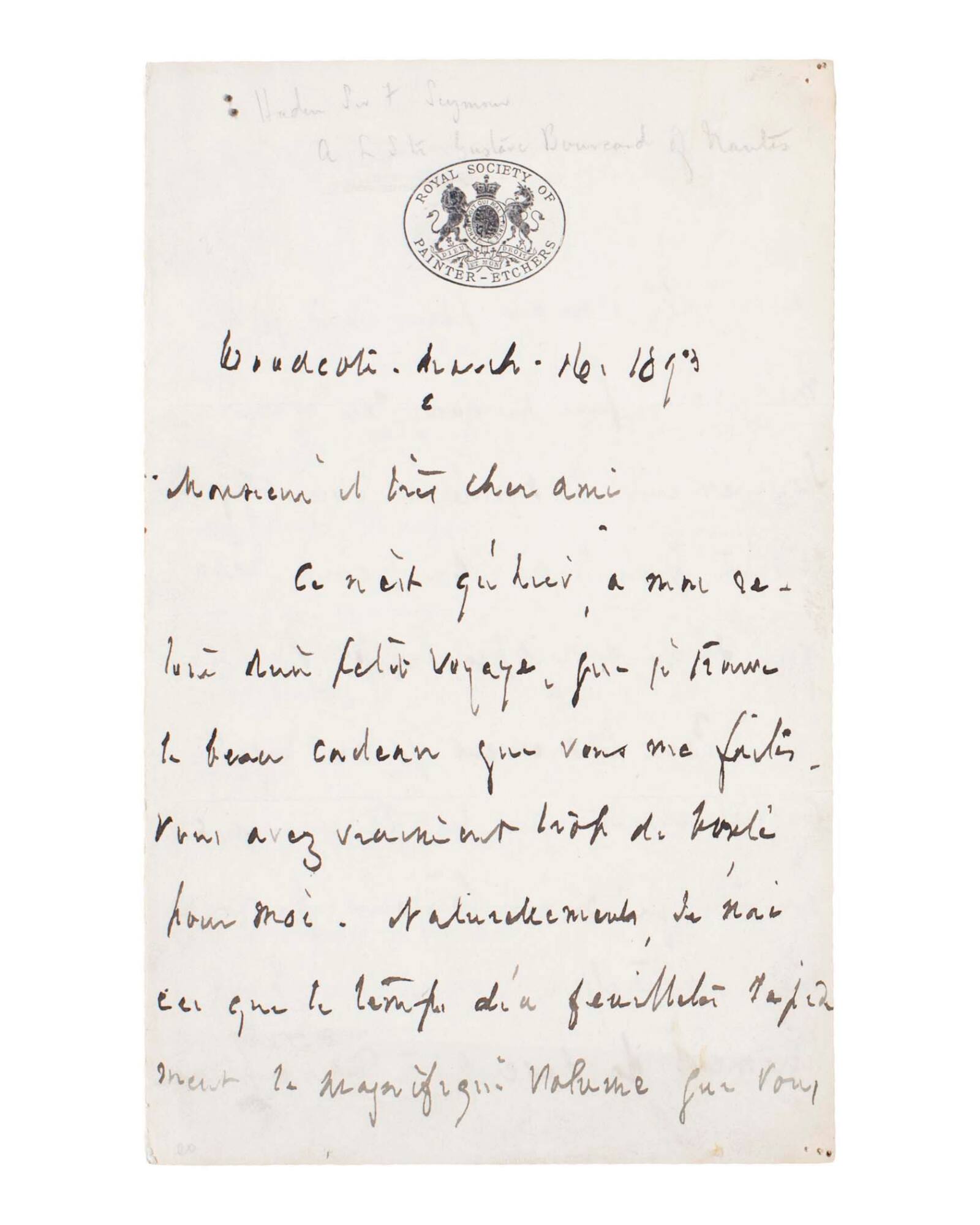 Autograph letter in French from Seymour Haden to Gustave Bourcard
