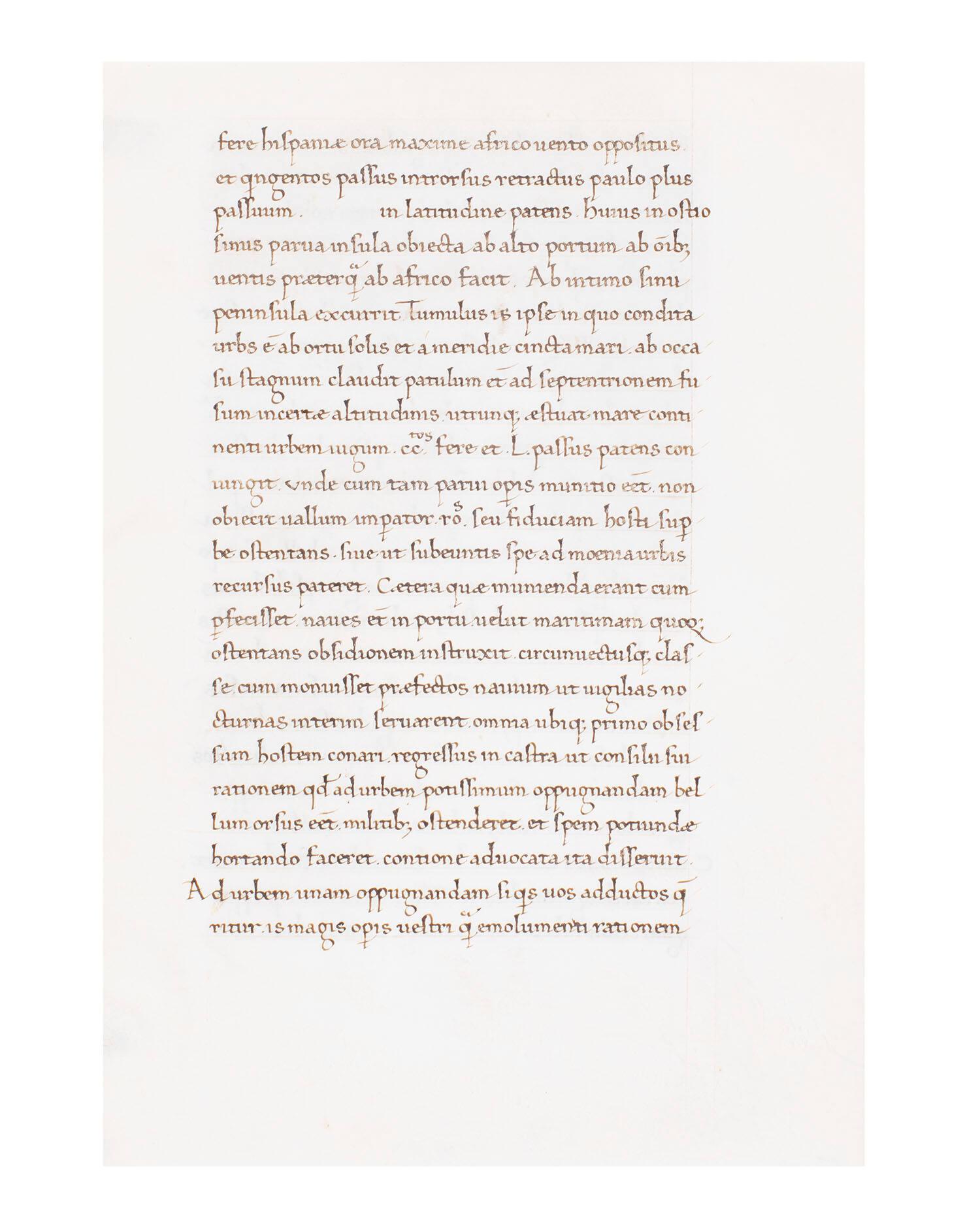 Label TextThis manuscript leaf preserves a pivotal passage from Titus Livius's monumental Ab Urbe Condita (History of Rome), specifically Book 26, chapters 42-44. The text narrates one of the most celebrated military operations of the Second Punic War: the 25-year-old Publius Cornelius Scipio's lightning conquest of Carthago Nova (modern Cartagena, Spain) in 209 BCE. The manuscript contains Livy's detailed account of Scipio's strategic decision-making, his famous speech to the troops, and the dramatic assault on the heavily fortified Carthaginian stronghold. This episode marked a turning point in Rome's reconquest of the Iberian Peninsula and established Scipio's reputation as one of Rome's greatest generals—the man who would ultimately defeat Hannibal at Zama.Mid 15th century