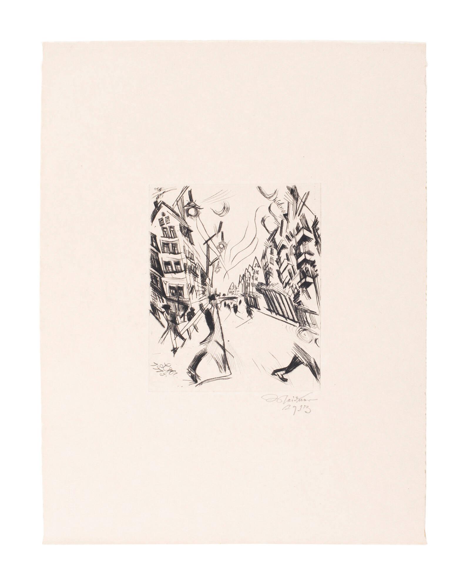 Label TextStreet scenes of Berlin and its environs, Ludwig Meidner was particularly drawn to the frenetically expanding metropolis that he found brutal, menacing, thrilling, corrupt, and on the verge of catastrophic self-destruction. This drypoint of Wilmersdorf, a Berlin suburb, reflects the social and emotional upheaval of Germany on the brink of what artists ands other intellectuals hoped would be a cathartic and regenerative apocalypse. Buildings are on In his the verge of collapse, the sky bursts with dynamic power both energetic and terrifying, while the isolated residents plod on, seemingly unaware of the coming storm. As Meidner wrote, “Painters, poets—who else is obliged to fight for the just cause but we? In us the conscience of the world pounds mightily.”Published Referencescf.: Ludwig Meidner: An Expressionist Master (Ann Arbor: University of Michigan Museum of Art, 1978): 67-68. cf.: Ludwig Meidner: Apocalyptic German Expressionist (Milwaukee: Milwaukee Art Center, 1976). cf.: Disengni di Ludwig Meidner (Milan: Galleria del Levante, 1965). cf.: Eliel, Carol, The Apocalyptic Landscapes of Ludwig Meidner, Los Angeles, Los Angeles County Museum of Art, 1989. cf.: Breuer, Gerda, Ludwig Meidner: Zeichner, Maler, Literat 1884-1966, Darmstadt, Ausstellunshallen Mathildenhohe Darmstadt, 1991.Exhibition HistoryTMA New Works on Paper Dec. 2005 - Mar. 5, 2006Rembrandt van Rijn