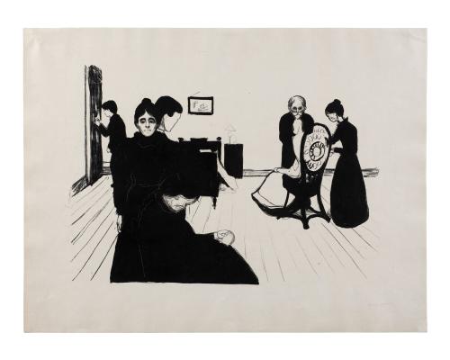 Label TextMunch’s predilection for images of grief and despair was due in part to his early and repeated encounters with death, experiences that were for him a constant source of creativity and inspiration. Death in the Sickroom recalls the death of his sister Sophie in 1877 when she was fifteen and he a year younger. The artist did not portray death itself, but rather its effect on those left behind, suggesting the ever-present nature of pain and loss. He evoked the subject’s desolation though the rigid poses, blank spaces, and stark contrasts of black and white. This lithograph was to be part of Munch’s never-published portfolio The Mirror, his graphic counterpart to his painted Frieze of Life.Published ReferencesToledo Museum of Art, Toledo Museum of Art Masterworks, Toledo, 2009, p. 282, repr. (col.).Exhibition HistoryToledo, The Toledo Museum of Art, The Painter Was a Printmaker, June 23 - Sept. 9, 1984.