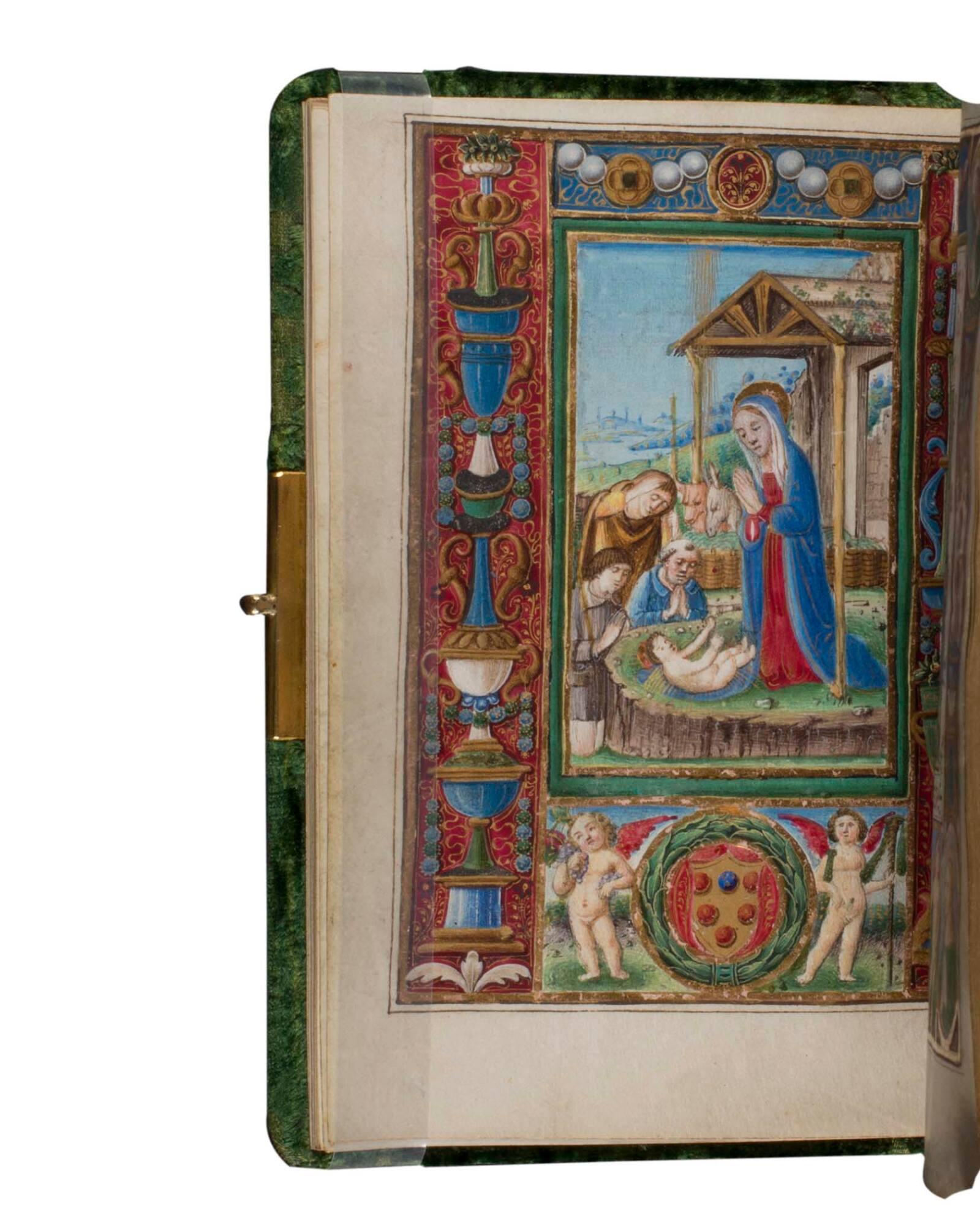 Label TextThis manuscript contains the liturgy for the Office of Matins on Christmas morning (preceded by a miniature of the raising of Lazarus with a skeleton on the facing page); Penetential Psalms (preceded by a miniature of a praying saint); The Canticle of Isias the prophet (preceded by a miniature of the Presentation of Christ on the steps of the Temple); Liturgy for the Feast of Exaltation of the Holy Cross, beginning with a Communion Mass (preceded by a miniature of Christ bearing the Cross); and a hymn for the Office of the Holy Cross (preceded by a miniature of the Crucifixion). The chief interest of this manuscript, from a historical point of view, is that it was made for Pope Leo X (born Giovanni de' Medici, 1475-1521), who was elected to the papacy in 1513. (Note Pope Leo's name (right) and the Medici coat-of-arms (left) at the bottom of each page.) it is interesting to speculate why this handsome illuminated manuscript would have commissioned when the art and technique of printing was beginning to flourish in Italy. During his papacy, Leo X extravagantly promoted literature, science, and art. He sought to increase the treasures of the Vatican Library, while also supporting the completion of Raphael's decoration of the Vatican (Stanze) halls. However , he was so lavish with his patronage and expenditures, that by the spring of 1515, the papal treasury was entirely dissipated. Yet while he was pursuing the course of a grand patron of culture, Leo X also had to turn his attention to various troubling political and religious events happening at this time. France repeatedly endeavored to gain control of Milan; Emperor Maximilian in Germany challenged Italian rule over selected states and papal authority outside Italy; there was turmoil in the Duchy of Urbino; and in 1517 Martin Luther triggered the reformation that was to challenge and completely upset the absolute authority of the Catholic Church. This tiny volume gives no hint of the historical events or circumstances which were the backdrop to its creation. Religious ritual is above temporal concerns. It was intended for the private use of Pope Leo in the performance of his religious duties Although other manuscript (or printed) copies of these offices undoubtedly existed, this unique copy was intended as his own personal copy. A lavishly decorated manuscript like this one, requiring much aesthetic work on each page, would have been more costly to produce, and thus more in keeping with the most exalted position in the church hierarchy. We may still wonder exactly when, where, and why this volume was created, and how it survived. but here it is as a vestige of Leo X's papal tenure.Published ReferencesConstant, John, "A Book of Hours for Pope Leo X," in Music from the Middle Ages through the Twentieth Century: Essays in Honor of Gwynn S. McPeek, University of Michigan, Ann Arbor, 1988, p. 314.