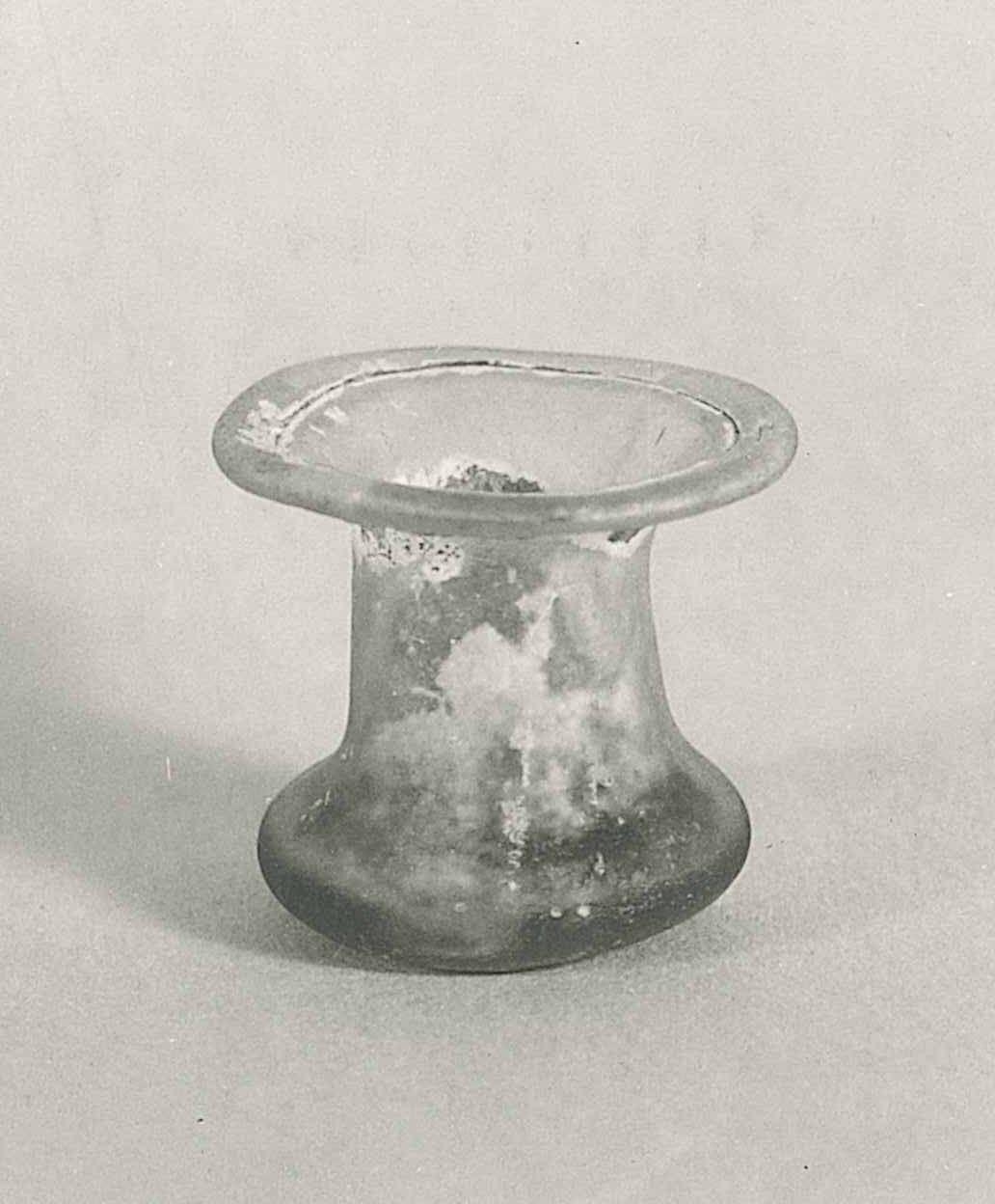 DescriptionThis diminutive thimble jar is made of thin, transparent natural pale green glass (10 G 6/2) and was free-blown and tooled. The vessel features a hollow rim that is horizontally outsplayed and folded outward, upward, and inward. The cylindrical neck broadens slightly at its base, and there is no distinct shoulder or body articulation. The base is flattened with a slight central depression and bears a circular scar from detachment, measuring approximately 1.0 cm in diameter. A few vertical linear bubbles are visible in the fabric of the glass.