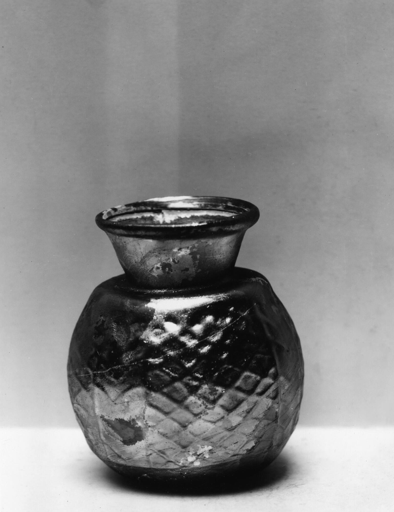 DescriptionThis small jar is made of thin, naturally light green glass with a subtle iridescence. It was blown into a patterned mold and then expanded and tooled. The jar has a wide mouth with a folded rim and a wide neck that tapers toward the shoulder. The body is spherical and decorated with a mold-blown pattern of four vertical bands of chevrons alternating with wider bands of diagonally crossed lines.