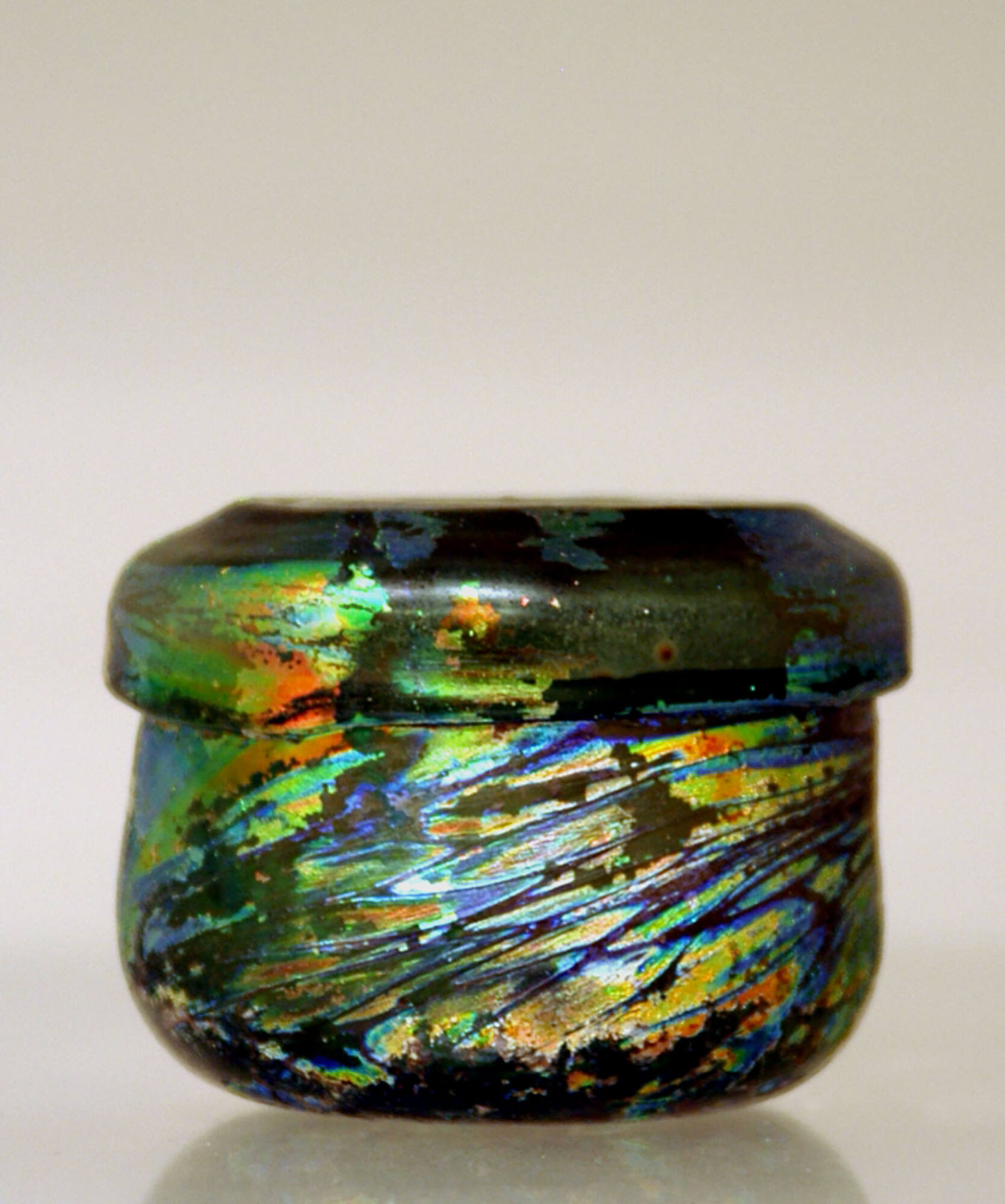 Hollow rim, folded outward across shoulder of vessel and partly down the side, then folded upward over first fold to middle of shoulder. Squat cylindrical body. Flat base with slight depression in center.