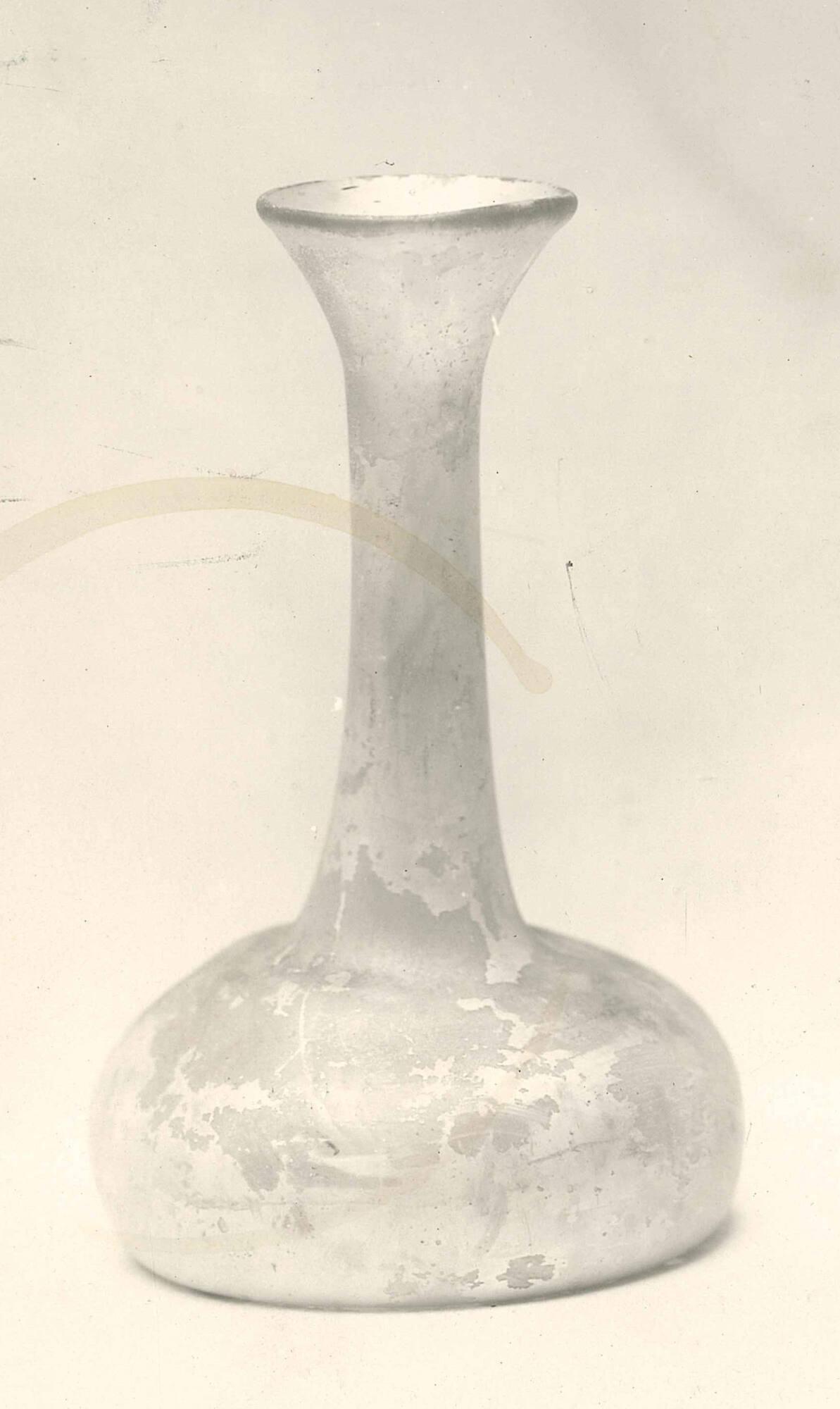 DescriptionThe bottle was made from transparent decolored glass using free-blowing and tooling techniques. It has a flaring rim that is rounded and thickened in the flame. The tall tapering neck transitions smoothly to the shoulder. The squat, bulbous body makes up less than one-third of the overall height and is widest below the middle. The base is recessed with a pronounced kick and a circular scar approximately 1.0 cm in diameter. The glass is thin with small vertically elongated bubbles in the neck and body, and vertical linear bubbles in the neck.