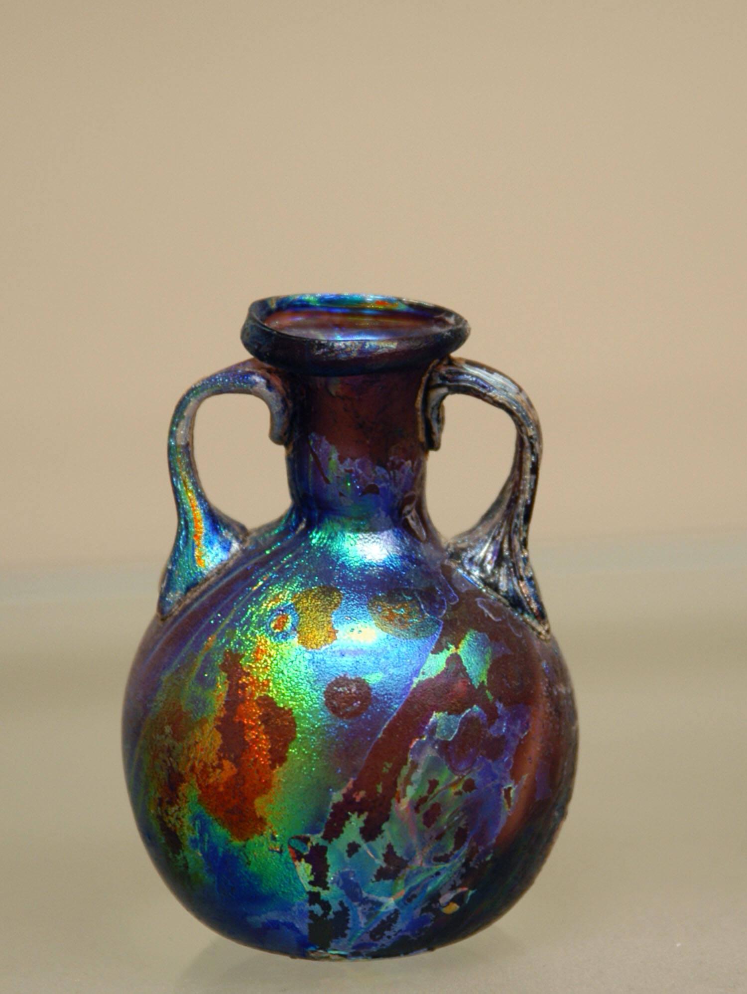 DescriptionThis small glass jar was shaped by free-blowing and finished with two handles. The rim is rounded and includes a decorative cut-out. The neck tapers slightly, leading to a spherical body and a flat base with a central dip.