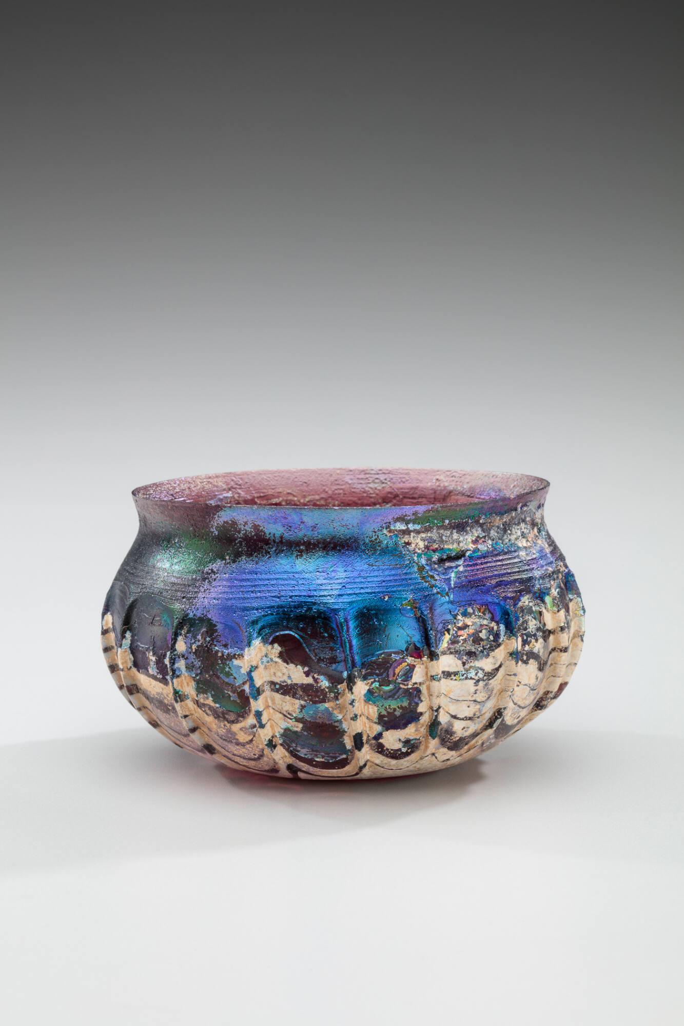 DescriptionSquat bulbous bowl of transparent to translucent dark manganese-colored glass with opaque white thread, classified as Isings 1957, Form 17. The vessel is free-blown, tooled, and decorated with applied thread. The thin fabric cannot be determined due to weathering. The rim is ground with a concave lip; the body is squat and hemispherical with a rounded base. Seventeen irregularly placed ribs run vertically from the base to the lip, each overlaid with opaque white spiral thread. A band of six shallow horizontal grooves encircles the lower part of the lip, corresponding to a band of polishing marks on the interior. Intact. The exterior exhibits creamy white weathering and an iridescent film. The interior has severe surface pitting with remnants of golden iridescence.