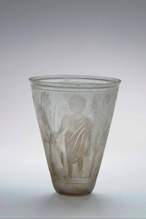 DescriptionThe beaker is made from transparent, decolorized glass with a very slight grayish yellow-green tinge (Munsell 6 GY 7/2). It is free-blown and lacks a pontil mark. The body is thin and contains a few small spherical bubbles. The form is conical with straight sides tapering toward a concave base, and it has a ground horizontal rim. The exterior is decorated with a wheel-cut and facet-cut figural scene framed above by one broad and one narrow horizontal band and below by two medium bands. The figural zone features four human figures alternating with trees and a single rock. From right to left, the scenes depict Christ raising Lazarus, Moses striking water from a rock, and a third unidentified figure holding a rod, all similarly posed.