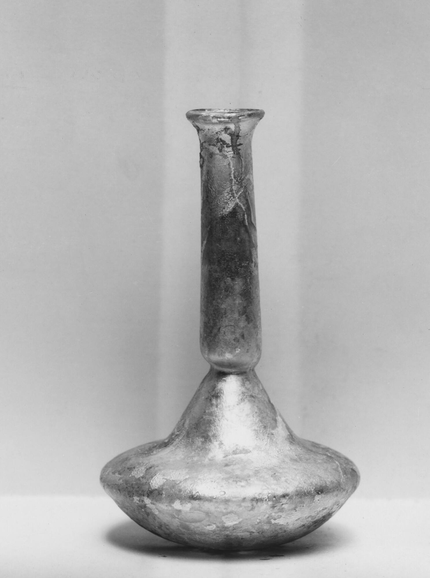 DescriptionThis vessel is formed of thin glass, transparent with a natural pale green tint (near 5 G 7/2). Numerous small vertical linear bubbles are visible in the neck. The piece was free-blown and tooled, with no pontil mark. The rim is everted and folded inward. It has a tall cylindrical neck with a pronounced constriction at its base. The carinated body displays a complex profile occupying about two-fifths of the total height, and it stands on a flattened base.