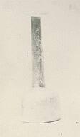DescriptionThis vessel is formed of medium thick glass, colorless with a yellow tinge, and is transparent. It was free-blown and tooled with no pontil mark visible. The broad tubular rim is folded outward, upward, inward, and flattened. The tall cylindrical neck shows a tool mark at its base and widens slightly toward the shoulder. The large bell-shaped body, which makes up less than one-third of the total height, ends in a concave bottom. On the exterior of the body, there is a shallow wheel-cut groove positioned about 1.8 cm below the neck. The overall form resembles a modern candlestick, which gives this vessel type its name: candlestick unguentarium