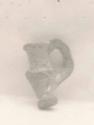 DescriptionThick almost opaque glass. Cone-shaped body on base with wide neck. One handle. Rounded rim, short cylindrical neck, biconical body, coil base. Thick thread handle applied to body and attached to rim where it is wound around the mouth to form a rim coil. Translucent to opaque dark purplish-blue. Zigzag thread around body.