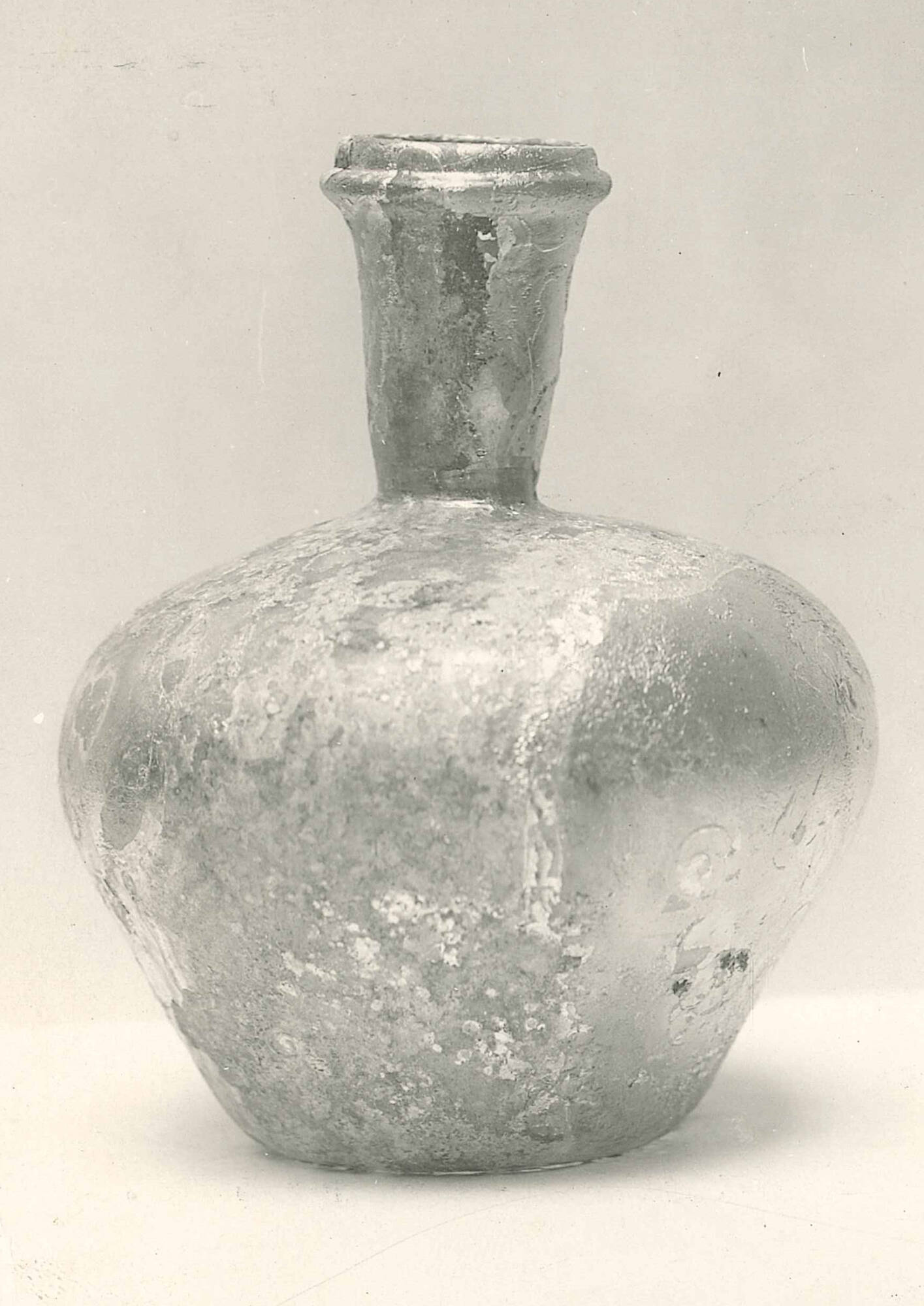 DescriptionThis object has a wide rim shaped by heating and a funnel-like neck that narrows at the base. Its walls taper downward in a straight, cone-like form, ending in a concave bottom. The exact color is uncertain due to weathering, but it was originally green and made using blowing techniques.