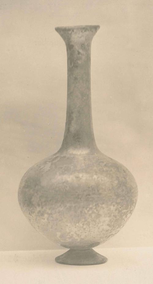 DescriptionThis pale green glass bottle was made around the 4th century CE. It has engraved horizontal lines around the body, a tall neck, and a ring-shaped foot. The rounded body and spiral marks show how it was shaped by hand.