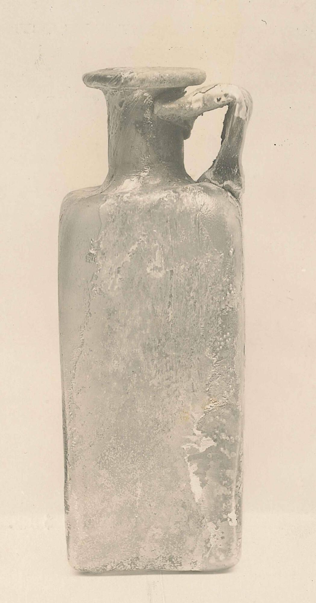 DescriptionThis bottle is made of thick glass that is transparent to translucent natural pale green, though the exact color and fabric cannot be determined because of weathering. The body was blown into a one-part mold with a patterned base, while the neck and mouth were formed by free-blowing. There is no pontil mark. A hollow area on the lower part of the body, on the side opposite the handle, was probably caused by steam escaping from the bottom of the mold (see discussion 23.0563).