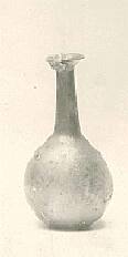 DescriptionThis glass bottle was made in the 1st to 2nd century CE. It is pale blue in color and weathered in appearance. The bottle has a rounded rim, a tapering neck, and a fully rounded body. The flat base has a small dip in the center.