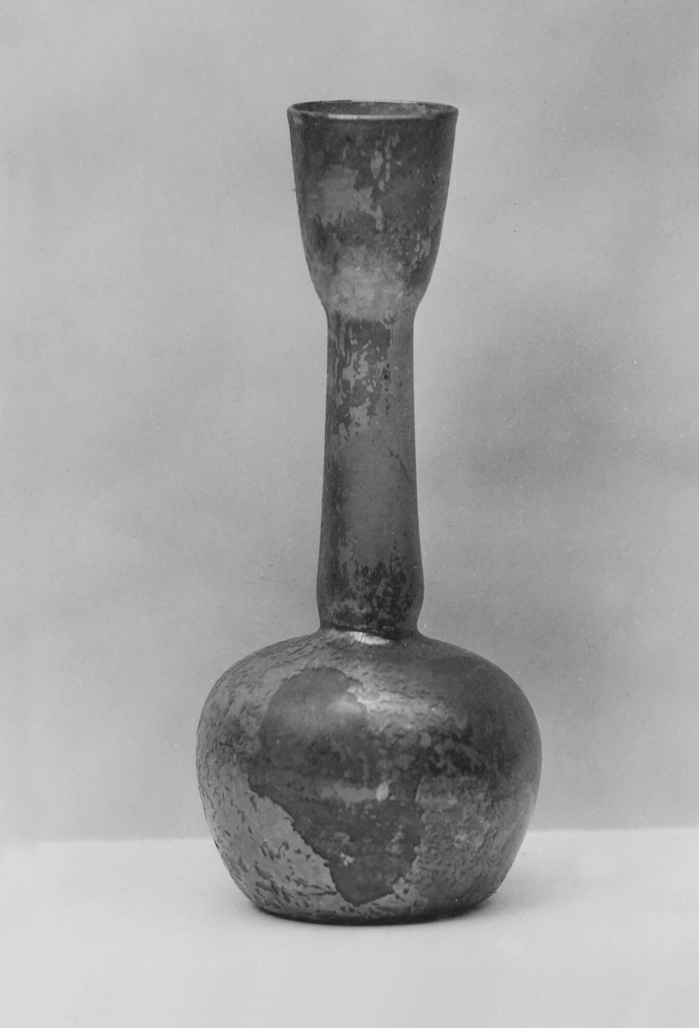 DescriptionThis thin glass bottle was made during the 4th–5th century CE. It has a tall neck with a slight bulge near the bottom, a chimney-shaped mouth, and a rounded body. There are tiny bubbles in the glass, which was blown by hand.