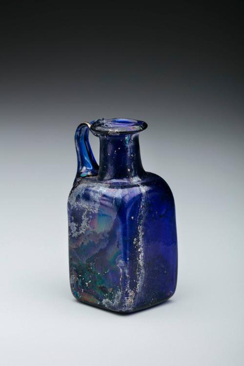 DescriptionThis small square bottle was made in ancient Rome during the 1st century CE using mold-blown glass. Its body was formed in a single mold, while the neck and rim were shaped by hand. Made from dark blue glass, it features a folded rim, a tall neck, and a square body with a handle stretching from the shoulder to the rim. Pinprick bubbles are visible in the glass, especially in the neck.