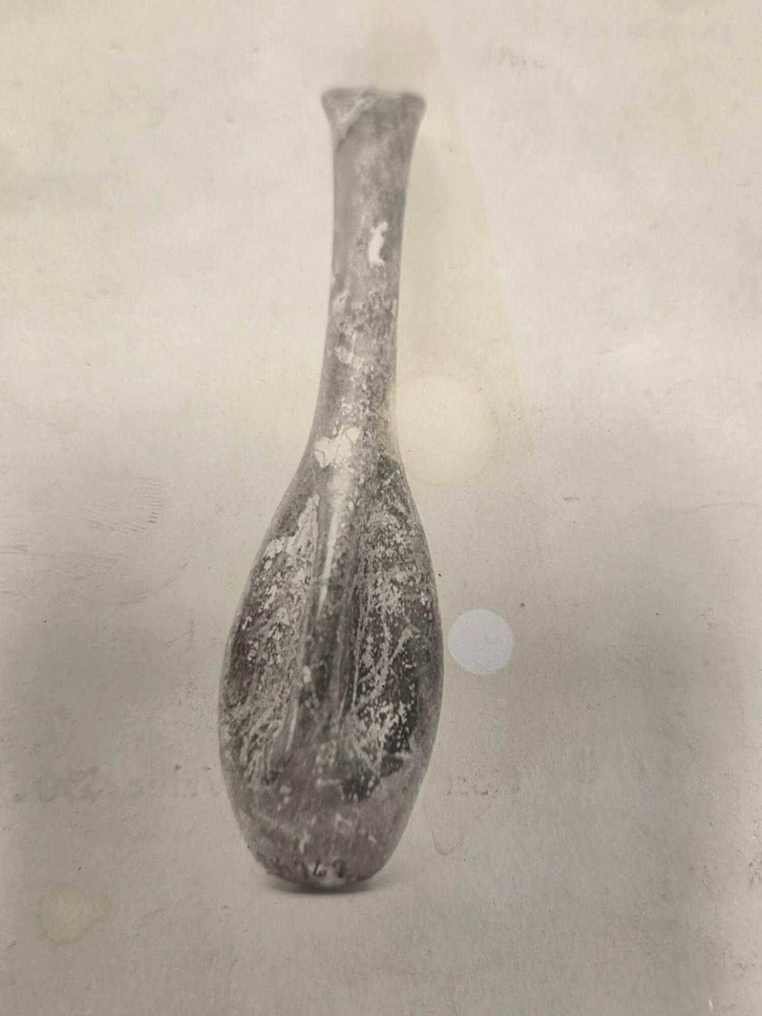 DescriptionKnown as an unguentarium, this glass bottle was made by shaping hot glass by hand. The bottle has a rounded rim, a narrow neck with a constricted base, and a tall body with gently curved sides. Its green glass contains small air bubbles.