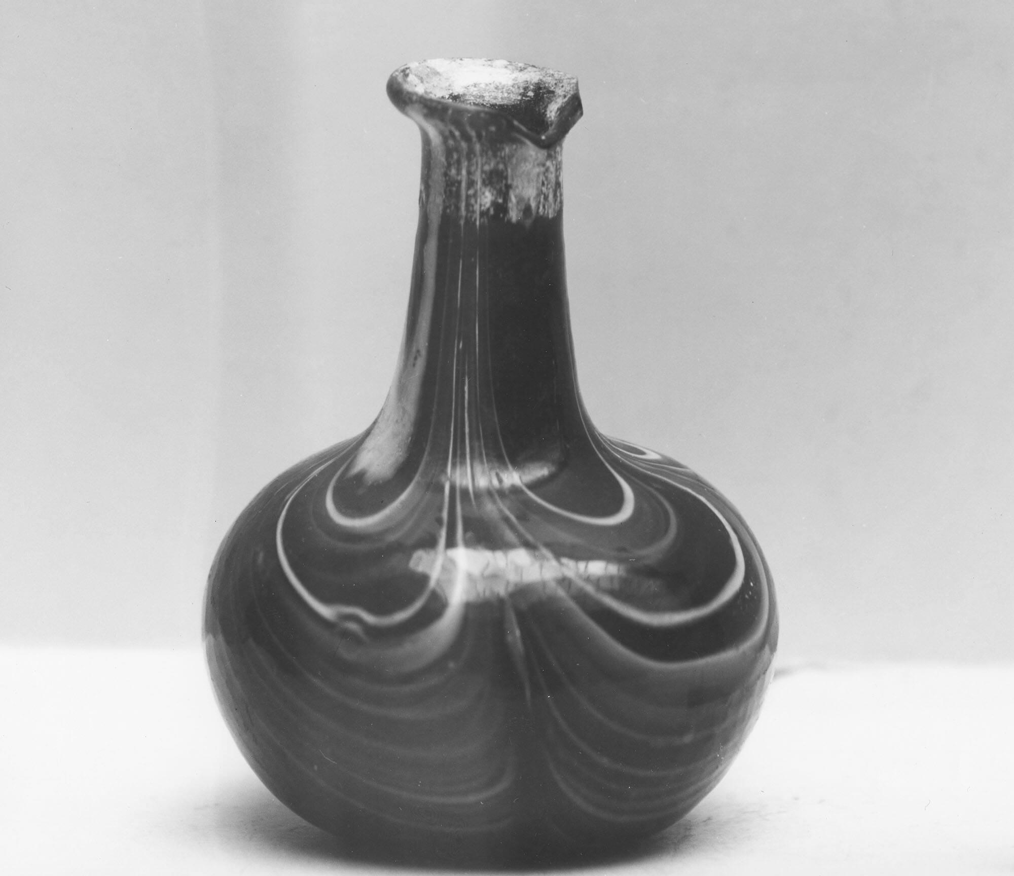 DescriptionThis squat bulbous bottle was made by free-blowing glass, picking up threads, combing them, reinflating, and tooling the shape. The glass is translucent amber (near 10 YR 6/6) with medium-thin walls and contains pinprick bubbles in the body and small vertically elongated bubbles in the neck. An opaque white thread was added, melted into the surface, and combed upward to form an irregular pattern of quadruple festoons. The bottle has an everted rim that is rounded and thickened in the flame, a tall slightly tapering neck with a curved transition to the shoulder, and a squat bulbous body with its greatest diameter near the shoulder. The base is flattened.