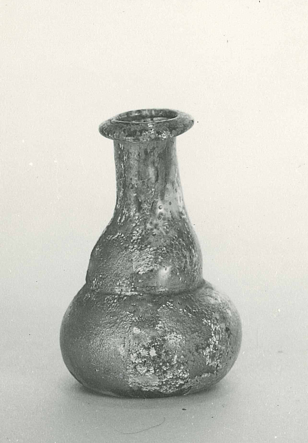 DescriptionThis double convex bottle is made of thin, transparent decolored glass with a pale green tinge and contains a few pinprick bubbles. The form was free-blown and finished with tooling. The triangular rim is folded outward, upward, inward, and flattened. A cylindrical neck with a constriction at its base joins a symmetrical double convex body, marked by a central constriction. The base is flattened with a slight central depression, and there is no evidence of a pontil mark.