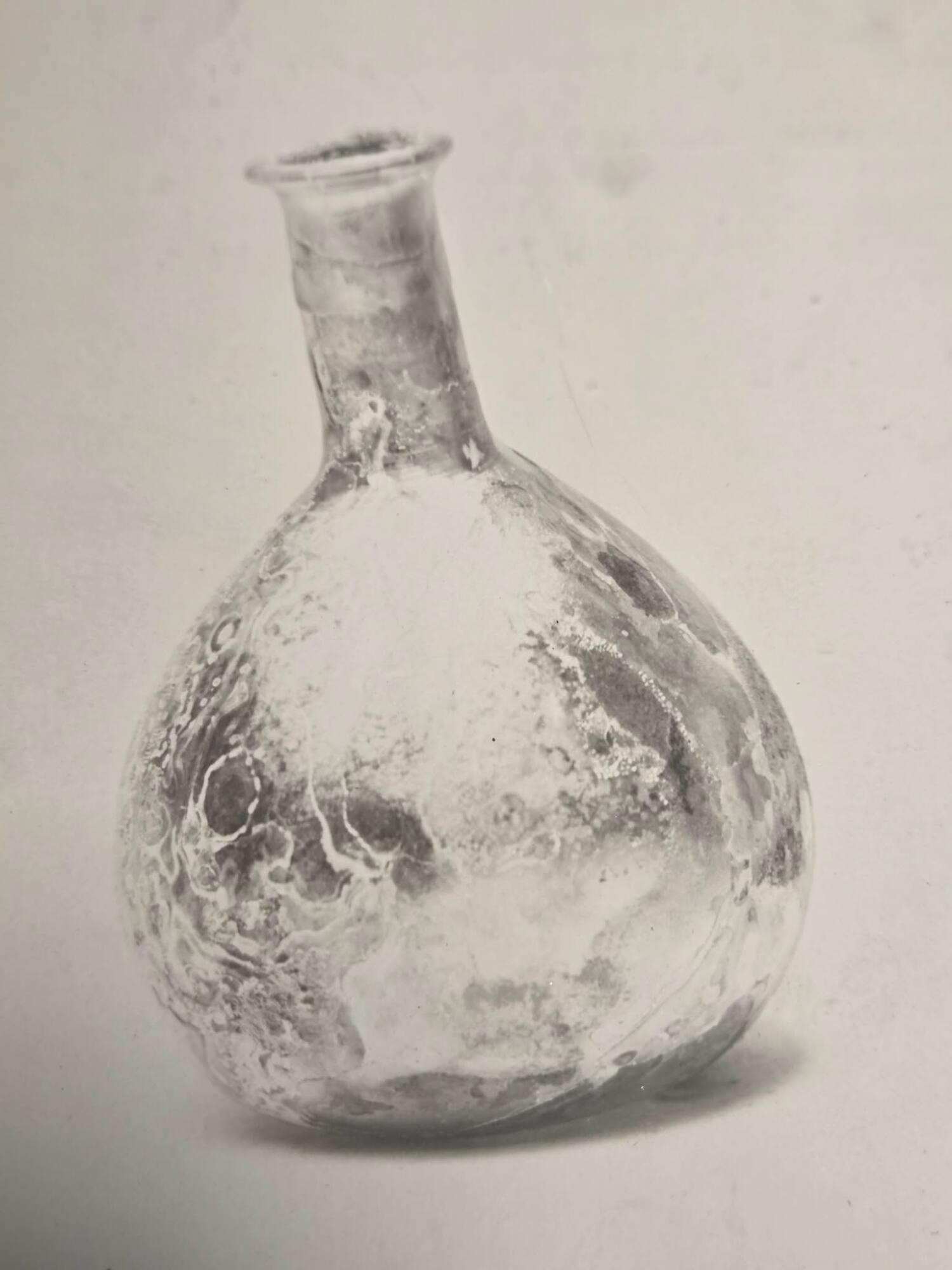This glass bottle was made in the 1st to 2nd century CE. It is pale green in color, though weathering has affected its surface. The bottle features a folded, wedge-shaped rim, a long neck, and a pear-shaped body. The flat base has a slight dip in the center.