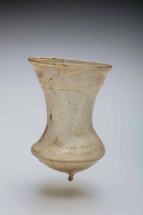 Label TextThis delicate glass beaker, known as a Sturzbecher (spill-vase) or "bell beaker," was the center of a Frankish social ritual. Because of its rounded, pointed bottom, it cannot stand on its own. Once filled with wine or beer, the user had to hold it until it was empty, or drink the contents in a single draft before placing it upside down on a table.Published References"The Krug Collection of Glass Part II," Sotheby's, London, December 7, 1981, lot 238.