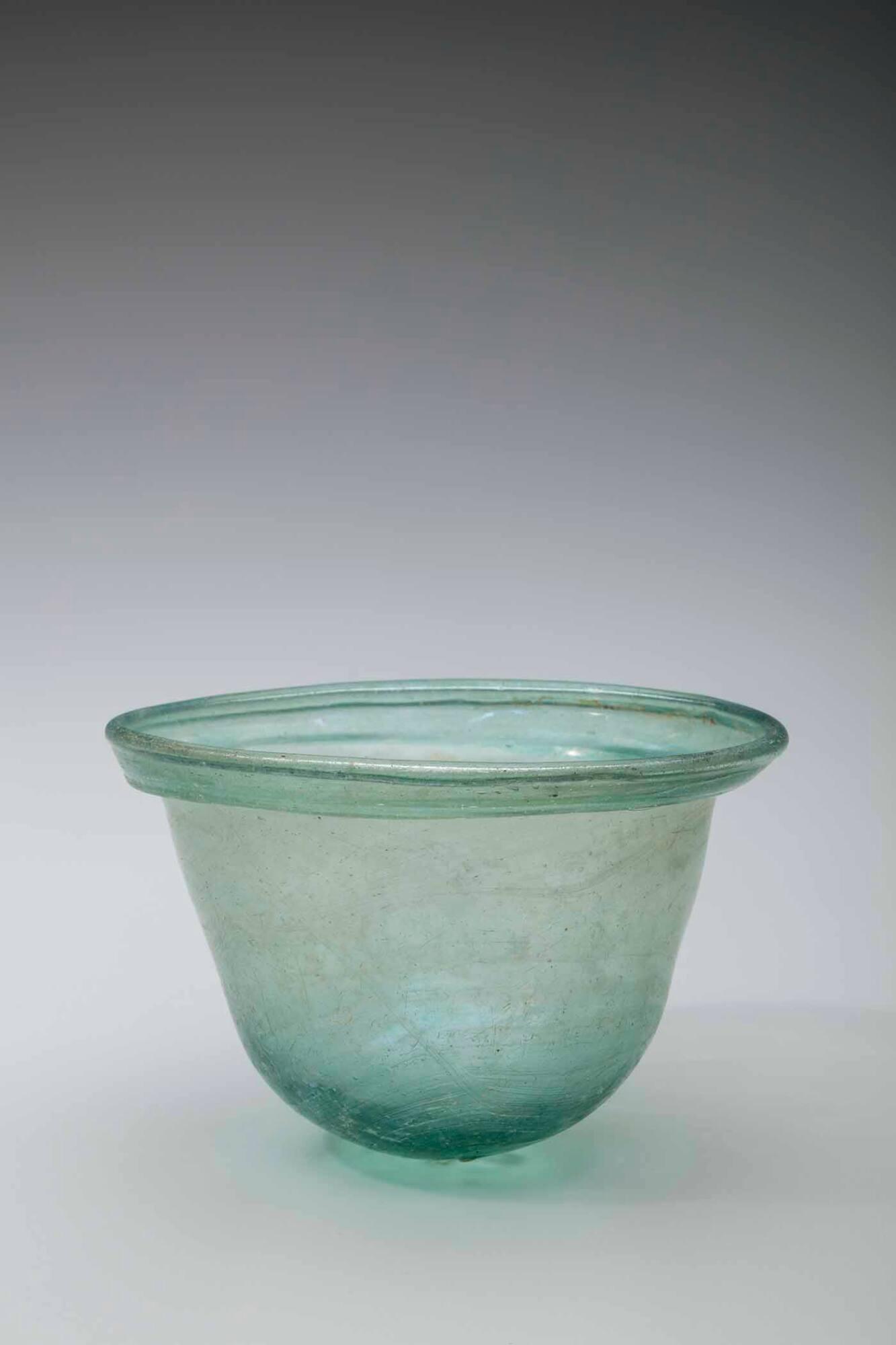 DescriptionA translucent, grayish-green glass drinking cup, free-blown with a wide, flaring mouth and a convex, unstable bottom. The rim is folded outward, downward, and inward to create a durable collar. The glass fabric contains small bubbles (seeds), black specks, and "blowing spirals." The vessel cannot stand upright on its own.