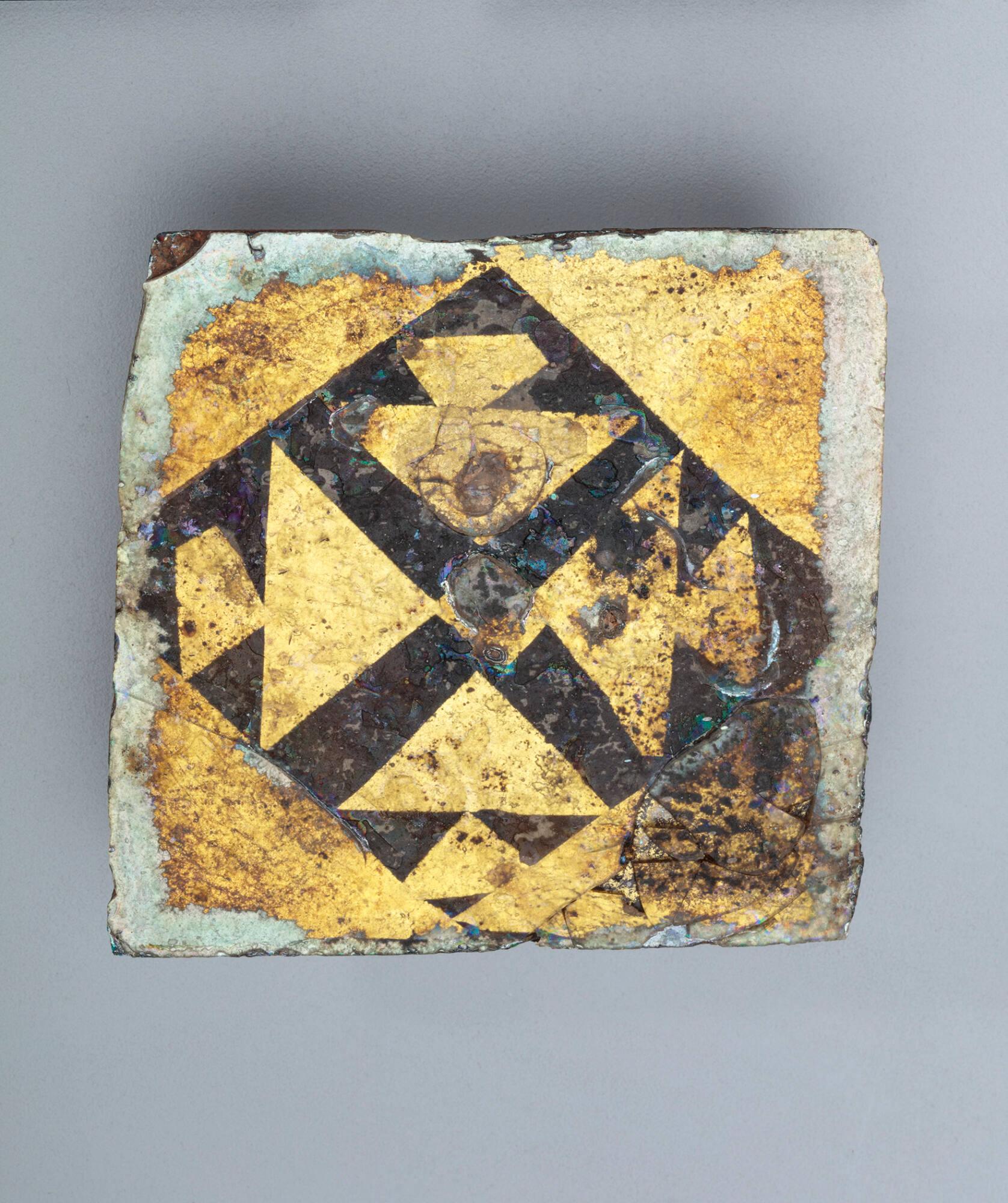 DescriptionSquare "sandwich" plaque with a thick (0.71 cm) green lower layer (pinprick bubbles) and thin (0.03 cm) grayish-yellow upper layer. Gold leaf forms a diagonal square containing four pairs of triangles centering on a small square. Edges are roughly chipped; a reddish-brown backing causes the exposed glass to appear black by inhibiting light transmission.