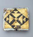 DescriptionSquare "sandwich" plaque with a thick (0.74 cm) green lower layer and thin (0.03 cm) grayish-yellow upper layer. A gold leaf cruciform design is sandwiched within. Unlike others in the set, the four sides are cut with only minor chipping. Features a reddish-brown rough backing on the reverse.