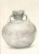 DescriptionThis vessel is made of medium-thin glass in a transparent natural green hue, although the exact color and fabric cannot be determined due to weathering. It is free-blown and tooled with no pontil mark. The tips of the two coil handles are drawn out thin and folded back to the shoulder.