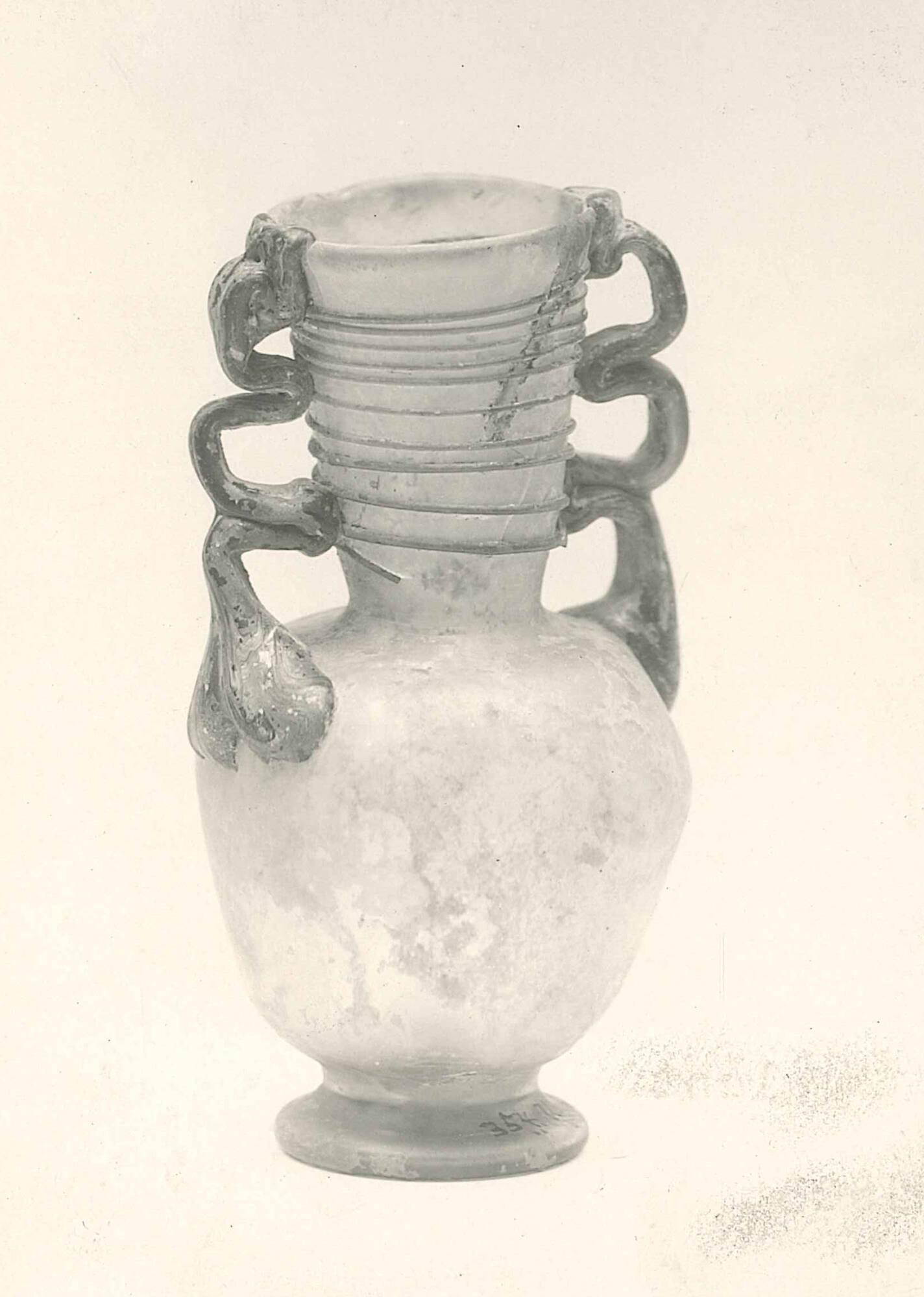 Two side trails, serving as openwork handles, are each formed into three loops. These are applied to the shoulder, touched down twice on the neck, and attached at the rim in a sequence of folded loops. Ten revolutions of thread spiral from just below the rim downward along the neck. The pontil mark at the base measures approximately 1.3 cm. Excess glass at the tips of the handles has been folded back against their tops