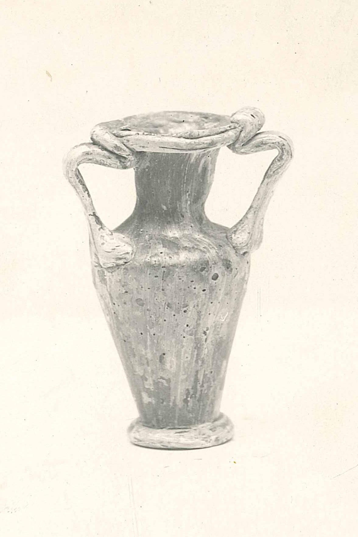 DescriptionThis small jar, made in the 2nd or 3rd century CE, is dark blue with green glass used for the rim, handles, and base. The rim flares irregularly and is wrapped with a coil, possibly to cover uneven edges. The neck is tubular with a bulge at the base, and the body tapers to a pointed bottom set on a small pad base. Two handles loop from the shoulder to the rim, folded into closed shapes. The jar shows signs of having been shaped and decorated while hot.