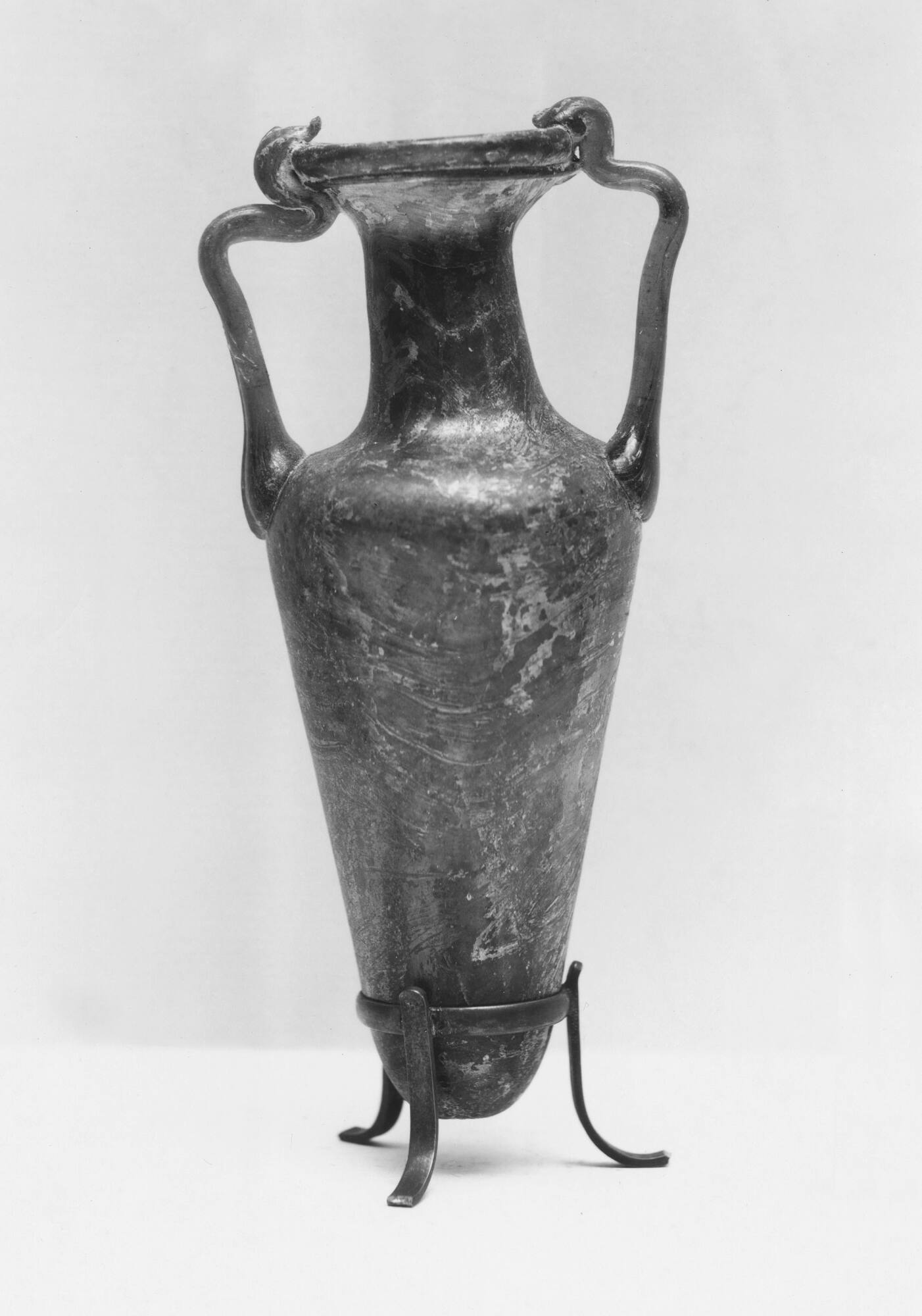 DescriptionThis small two-handled glass jar, called an amphoriscus, dates to between the 2nd and 4th centuries CE. It was shaped by blowing and tooling, with added decoration around the rim. The vessel is dark blue and shows small air bubbles and spiral marks from blowing. Two curved handles rise from the shoulder to the rim, where they fold over the edge.