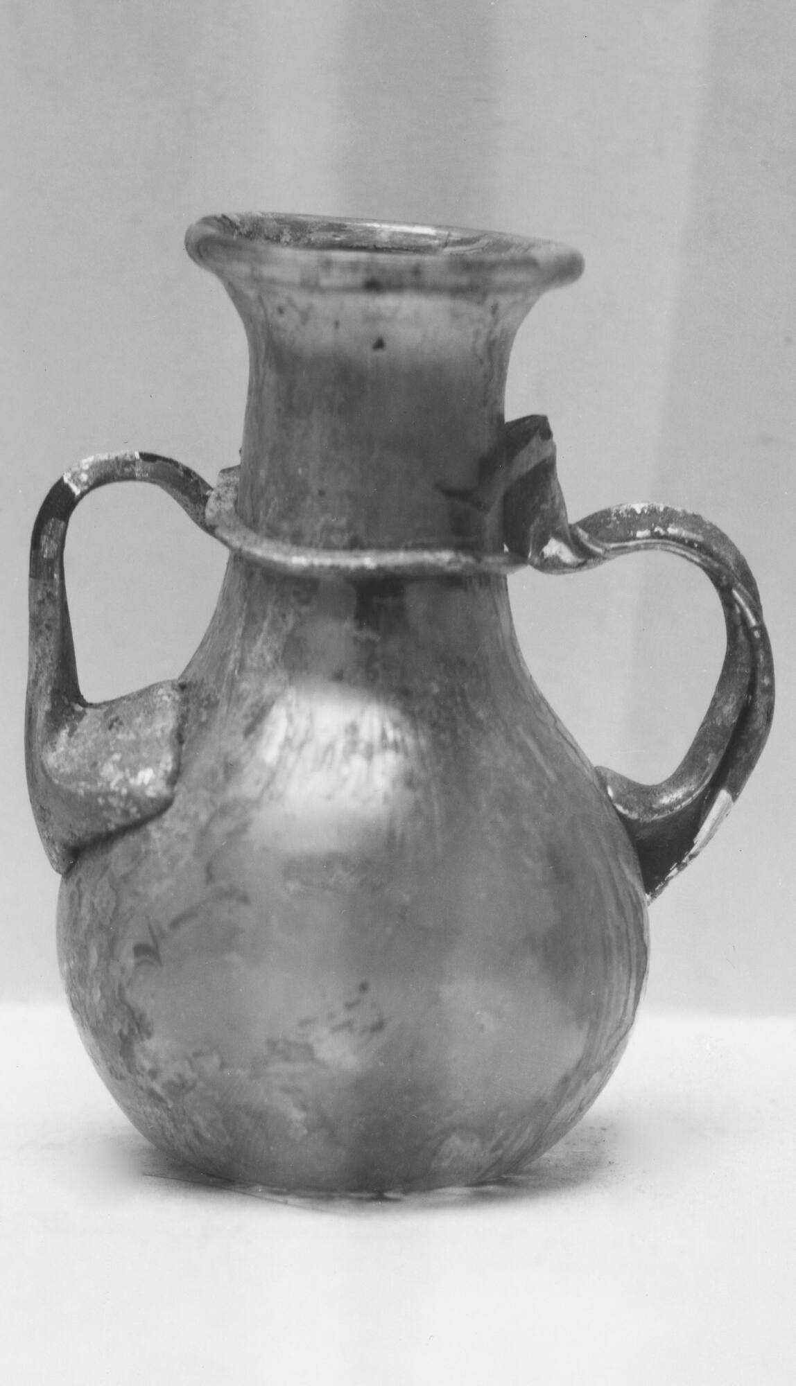 DescriptionThis bulbous bottle with two handles (Bottle II A 3 a, with handles I A 2 d) is made of thin, free-blown and tooled glass. It is a transparent natural grayish yellow-green (between 5 GY 7/2 and 5 GY 5/2), with translucent light olive handles. Blowing spirals are visible, and the fabric cannot be determined due to weathering. The rim is folded outward, upward, inward, and downward, with a tool mark on the interior. The vessel has a tubular neck, sloping shoulder, and a bulbous body widest below the midpoint. The base is concave with a pontil mark approximately 1.2 cm in diameter. Two curved coil handles are attached at the shoulder and lower neck, each trailing partially around the neck in opposite directions to form a neck coil. Excess glass from the handles is drawn out thin along the neck.