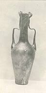 DescriptionThis glass bottle has a rounded body and two handles. It was made by blowing and tooling transparent reddish glass, which shows visible bubbles. The narrow neck rises from a sloped shoulder, and the two handles are attached at the shoulder and curve upward, possibly once meeting the rim.