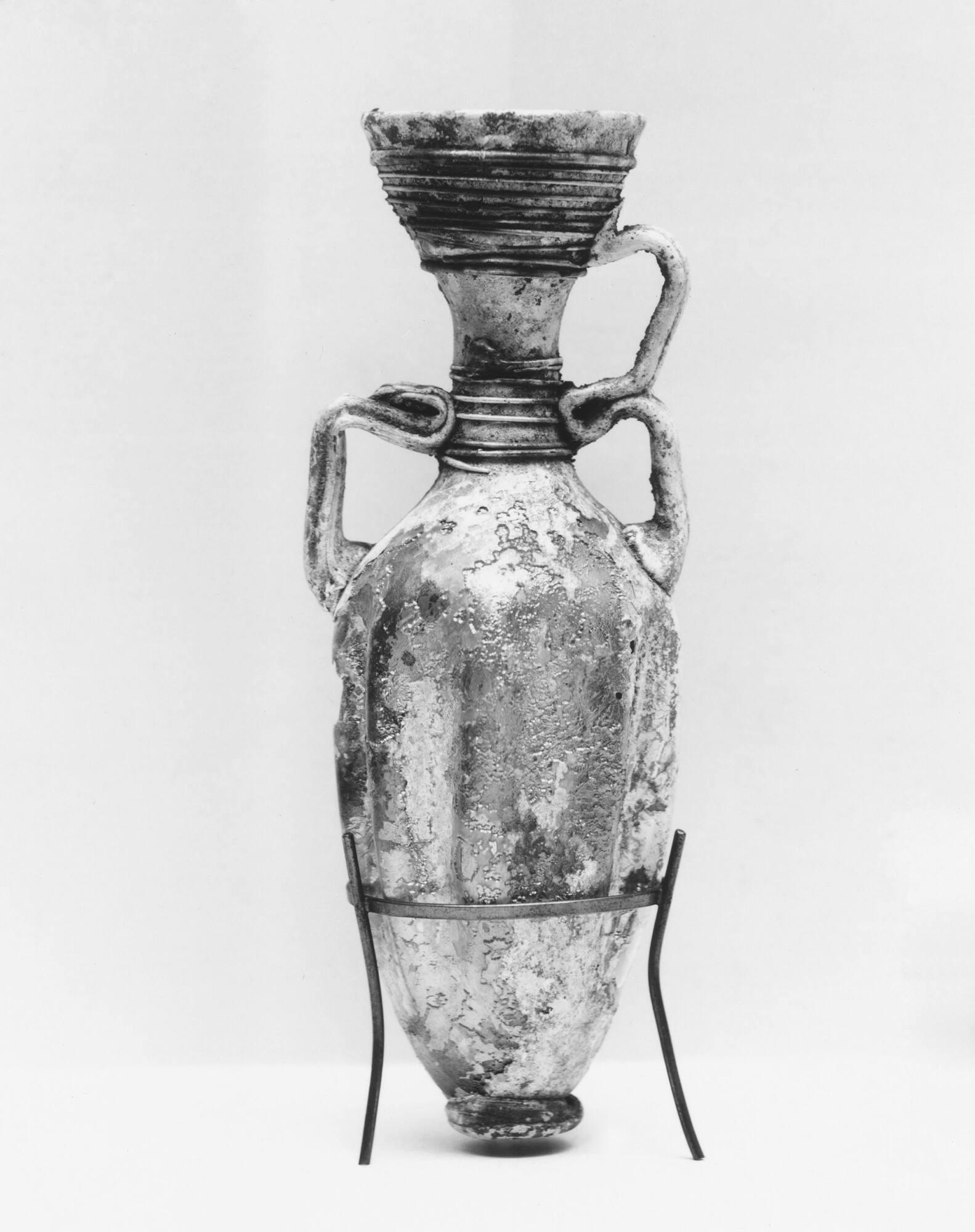 DescriptionThis glass bottle has a pointed base and two handles. The glass is pale green and has weathered over time. The neck is tubular, leading up to a funnel-shaped mouth. Two handles curve from the shoulder to the lower neck and mouth, forming loops.