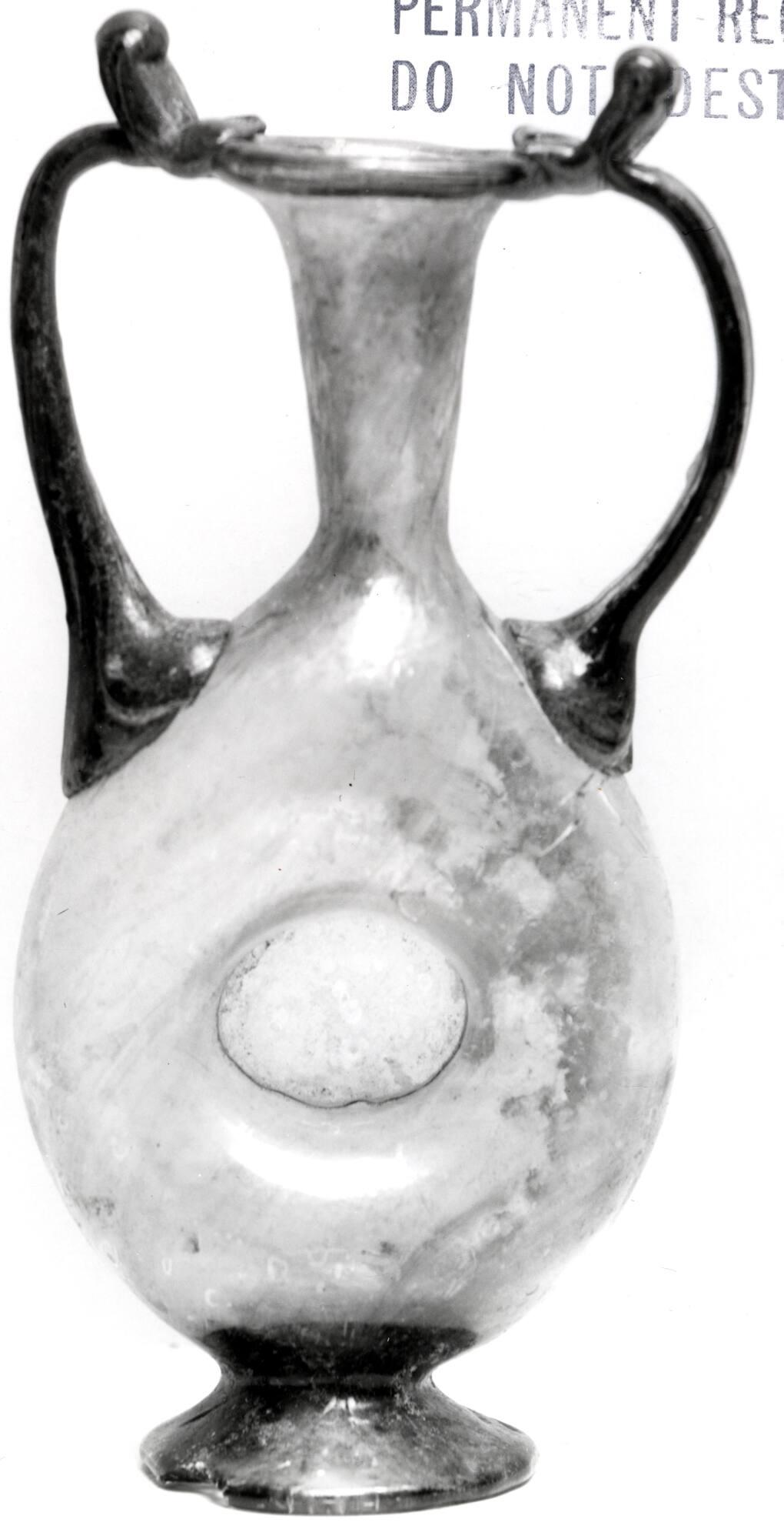 The hollow rim is folded outward, upward, inward, and downward, with a tool mark visible along the interior. It has a distinct mouth and a funnel-shaped neck that meets a steeply sloped shoulder. The circular, flat-sided body is formed by joining the body walls at the center, leaving an oval of flat glass measuring approximately 2.8 by 2.2 cm. The base is a pad base with diagonal tool marks on the exterior surface. Two curved solid handles are applied to the shoulder and attached to the rim. Each handle is folded upward, inward, downward, and pinched to form diagonal projections above the rim. The pontil mark is about 1.3 cm in diameter. Excess glass at the tips of the handles was folded back against the tops and flattened.