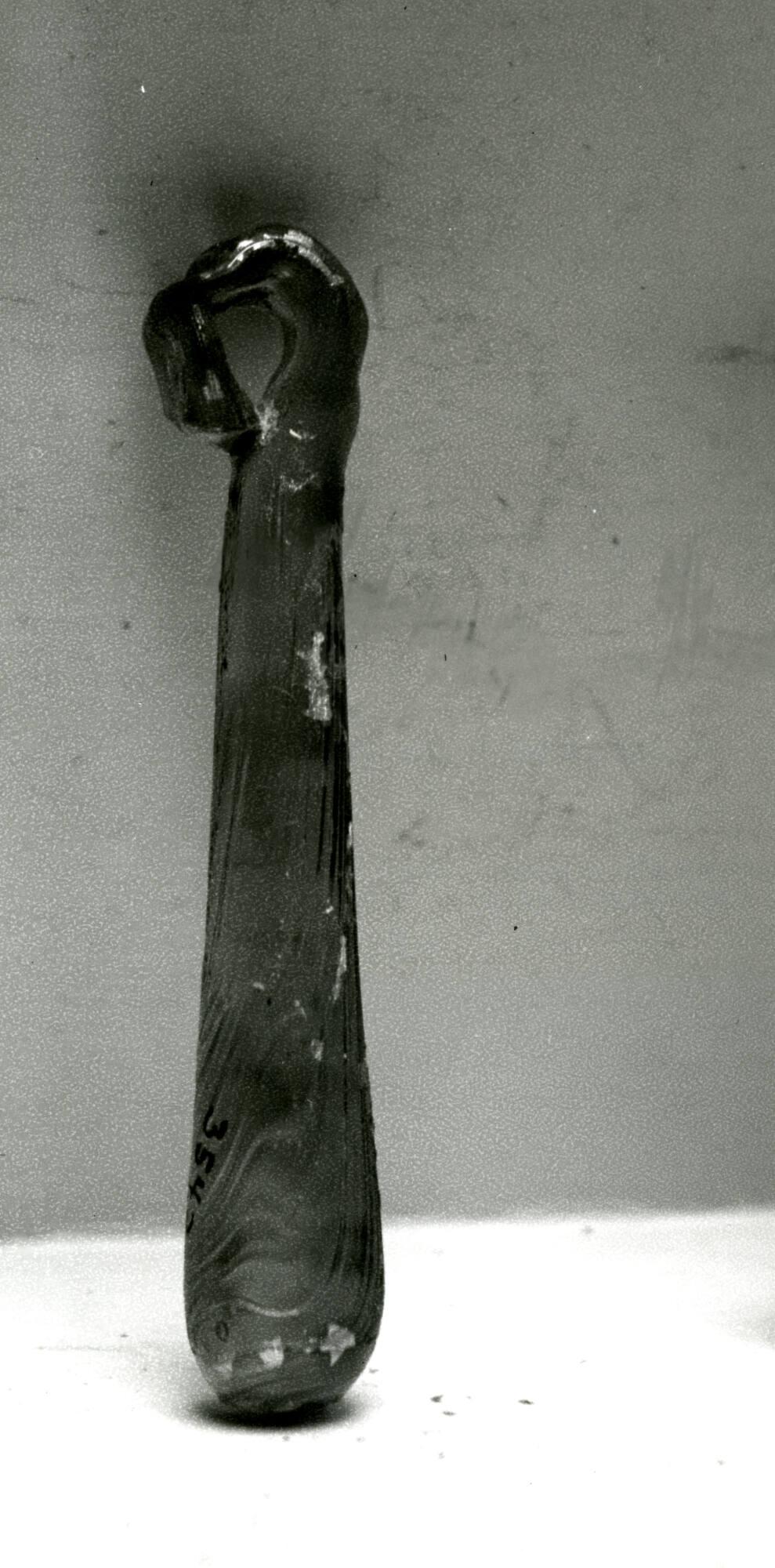 DescriptionThis solid object consists of a ring-shaped element with a long, tapering handle. It was formed by tooling and displays spiral marks from the blowing process, along with tool marks on the ring. A small pontil mark is visible at the base.