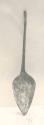 DescriptionMade from extremely thin glass, this spoon was free-blown and shaped by tools. The concave, shallow bowl was formed by flattening the bulb at the end of the handle, resulting in hollow areas near the edge. A pointed tip was created by pulling the glass with pincers. The long, hollow handle tapers and bends downward into the bowl.