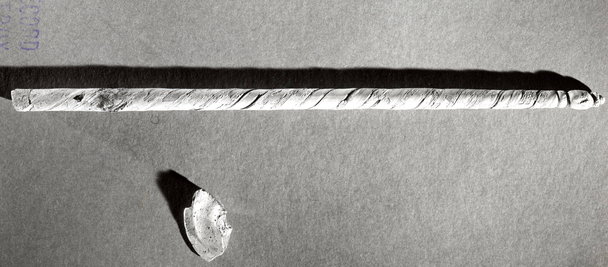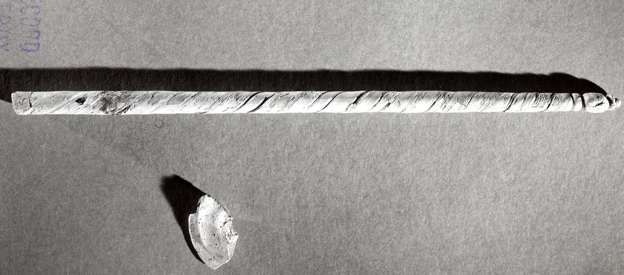 DescriptionThis object is formed of translucent natural pale green glass; the exact color cannot be determined due to weathering. An opaque possibly white glass thread spirals around the preserved length of the body. The spindle is solid, twisted, and tooled, with wheel-cut elements. Its long, tapering rod-like body ends in a finial that has a complex profile, consisting of a roughly ovoid element positioned between two disk-shaped elements and topped with a small bead-shaped cap.