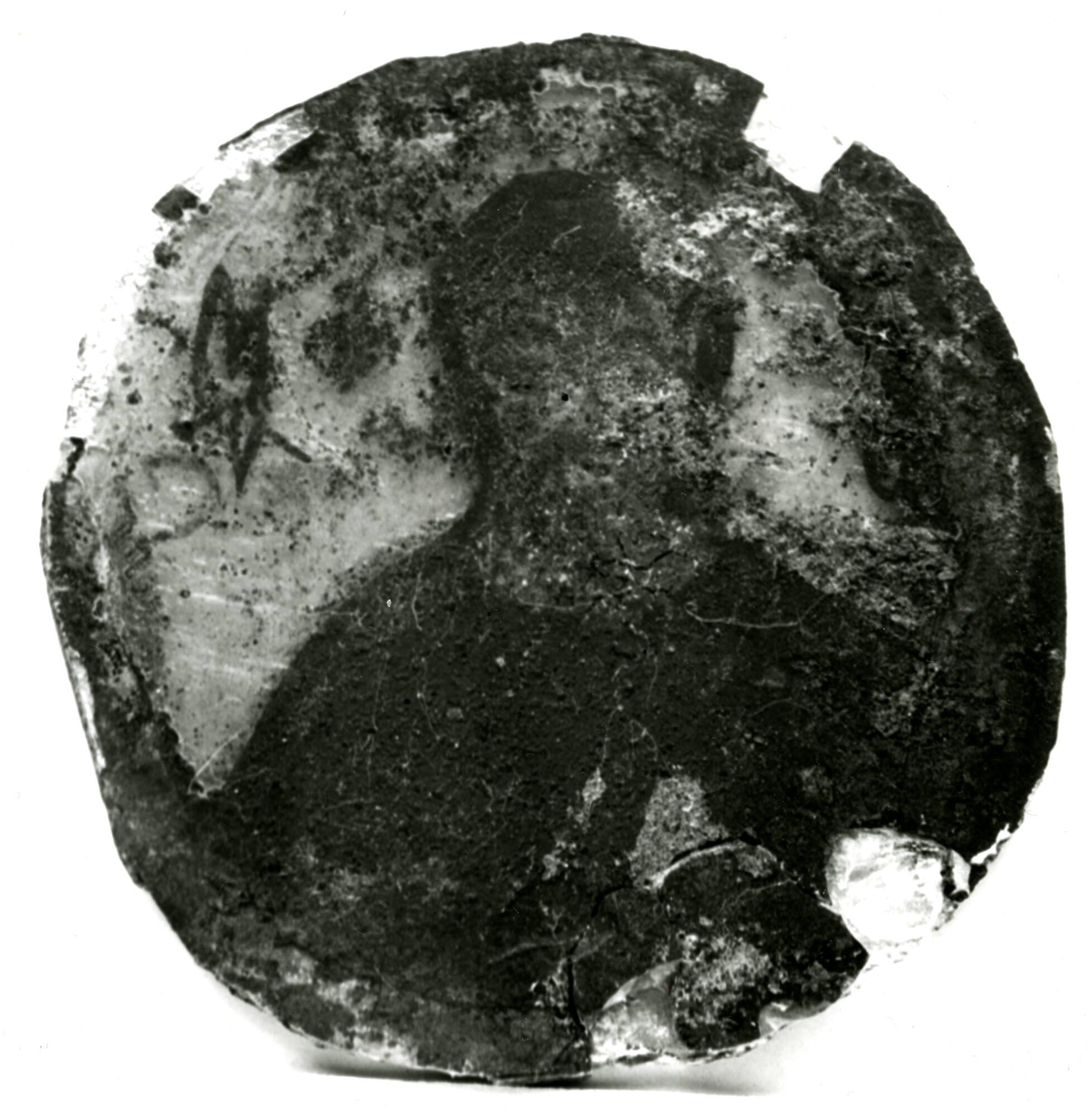 Cold-painted bust of a man en face with a circular nimbus painted in opaque white outline. He is painted in dull black outline with brown hair and tunic and reddish brown drapery. An inscription is painted in black letters to the right and left of his head. To the left: DISCUSS WITH PRINTER; to the right: DISCUSS WITH PRINTER.