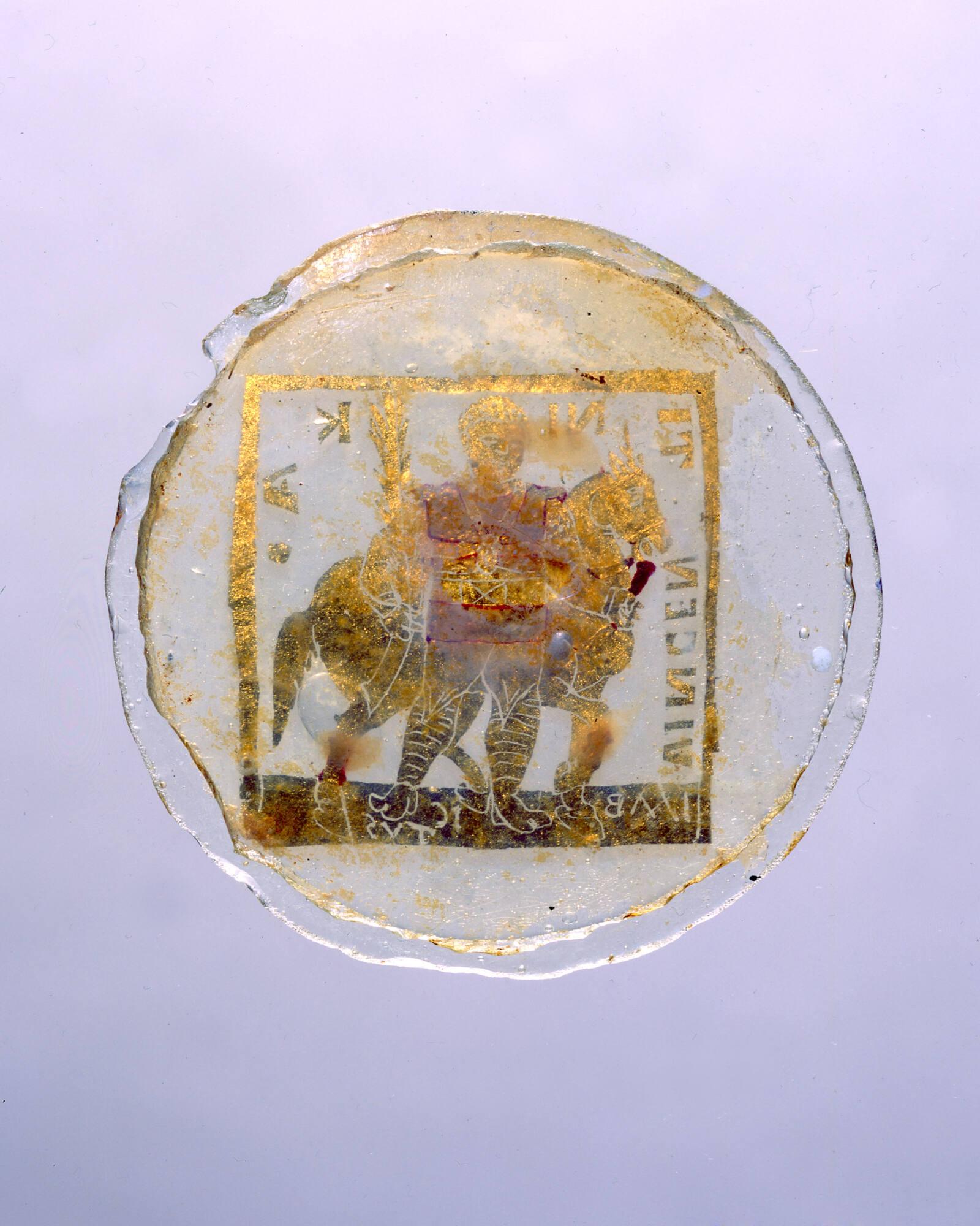 DescriptionCircular, slightly concave medallion composed of two layers of transparent, slightly greenish glass fused together. The design consists of a layer of gold leaf sandwiched between the glass layers, depicting a standing male figure and a horse. The figure stands frontally, holding a palm branch in his left hand and the horse's bridle in his right. He wears a long-sleeved tunic, a protective chest harness, belt, and leg wrappings. The horse stands in profile to the left. Details of the figure's tunic and the horse's tack are highlighted with red enamel. A Latin inscription (VINCENTI NIKA) frames the scene in the gold leaf, and a second inscription (IMBICTUS) is scratched into the gold band at the bottom. The edges of the medallion are chipped where the base was snapped from the original vessel.